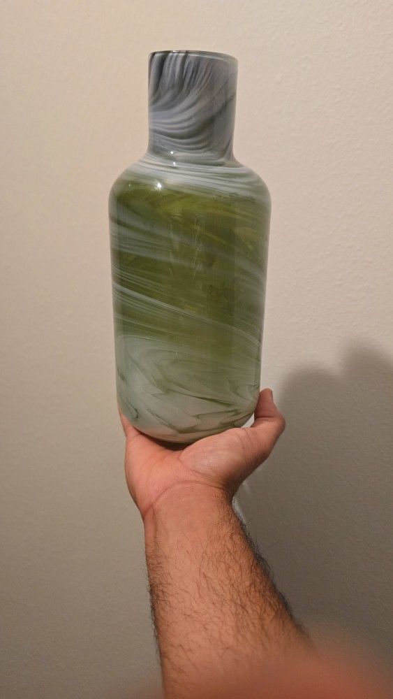 Iina Vuorivirta hand-blown olive green swirl art glass vase. - It features a distinctive green and white swirled design, with hints of grey/black in the neck area. - The vase is hand-blown and made of glass, with some sources indicating recycled or fused glass. - It was designed by Finnish designer Iina Vuorivirta. - The vase is approximately 10.5 to 11 inches tall. Pick Up from Thrashers corner bothell