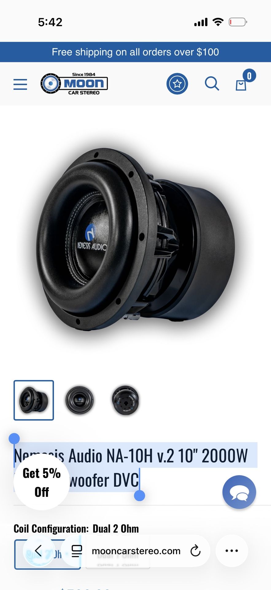Nemesis Audio NA-10H v.2 10" 2000W RMS Subwoofer DVC in low profile box. Description 4,000 Watts Peak 2,000 Watts RMS Die-Cast Aluminum Basket Non-Pressed Paper Cone Foam Surround 3.5″ – 4 Layer Flat Wiring Voice Coil 378 Oz High-Efficiency Magnet Tinsel Woven Leads on Nomex Spider Dual 2-Ohm or 1-Ohm Impedance