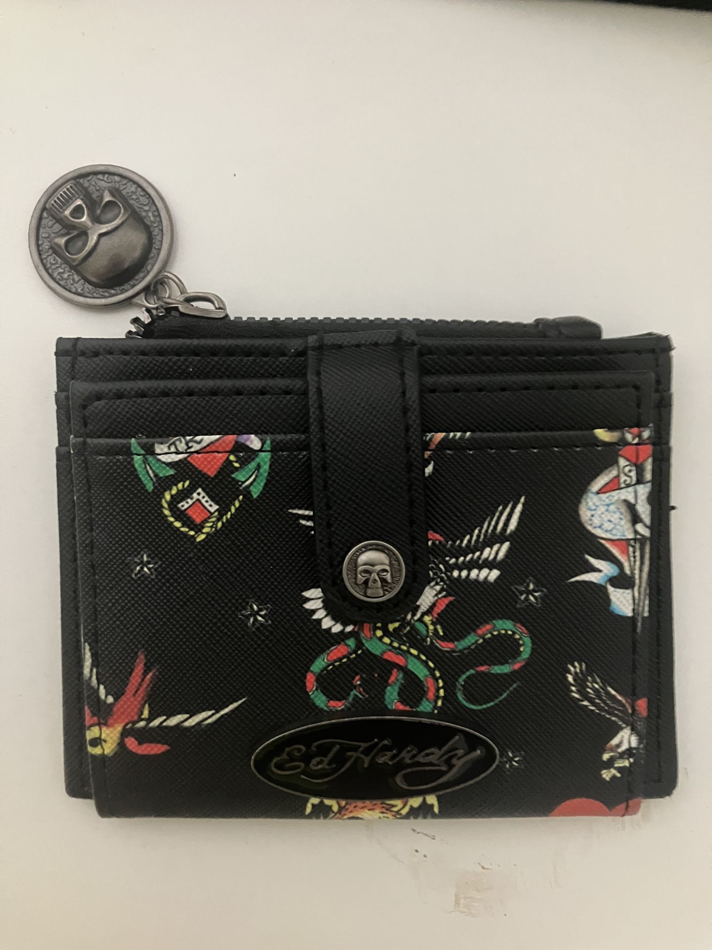 Cool Ed Hardy wallet/card holder. Has a sick black and colorful tattoo design with snakes and birds. Comes with a skull charm on the zipper. Plenty of card slots and a clear ID window inside. Great for everyday use.