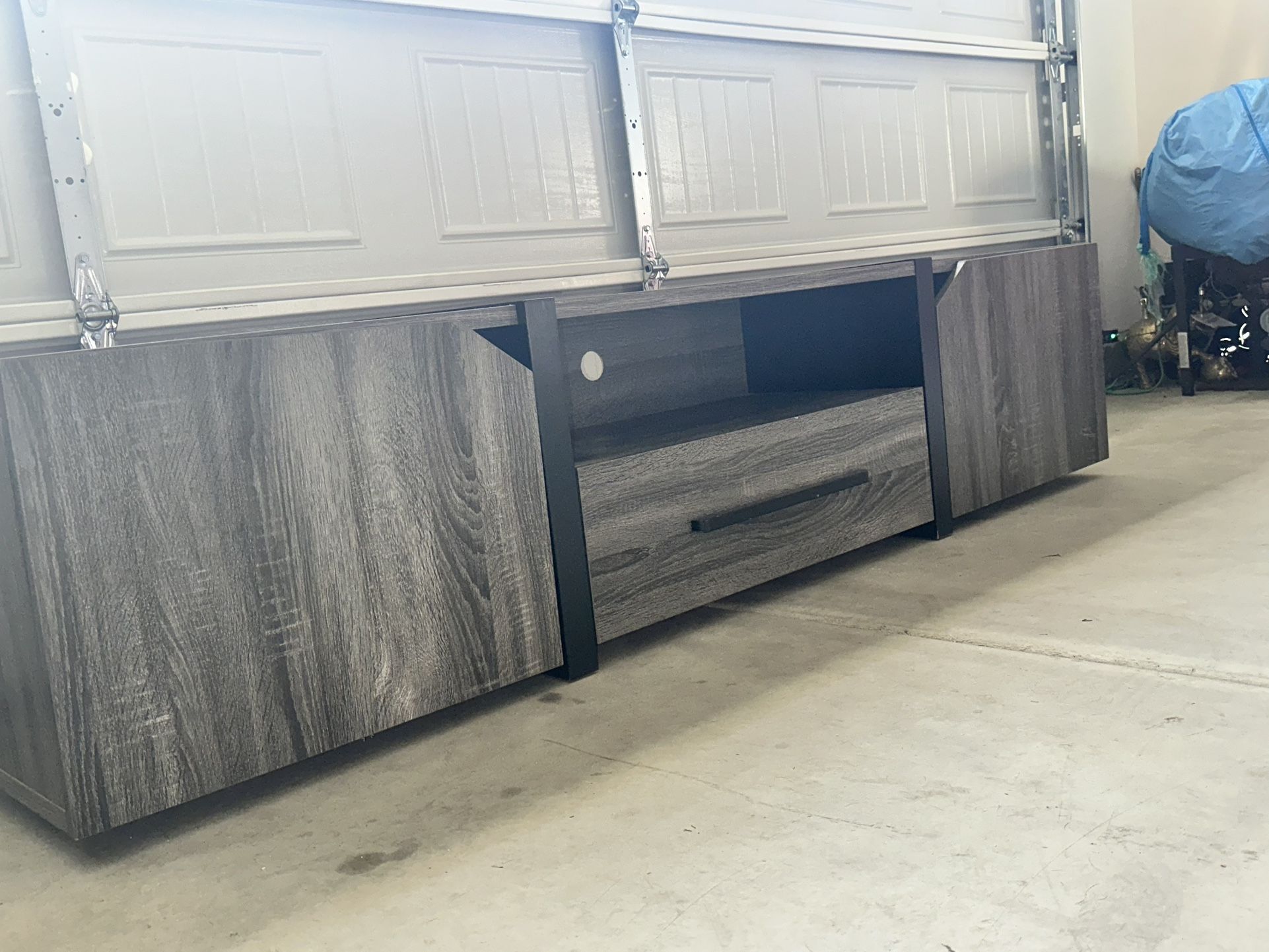 Wooden TV stand in amazing condition. No scratches or dents. 350 OBO. Willing to negotiate and drop off for an extra charge for gas. Dark gray stain design and black.