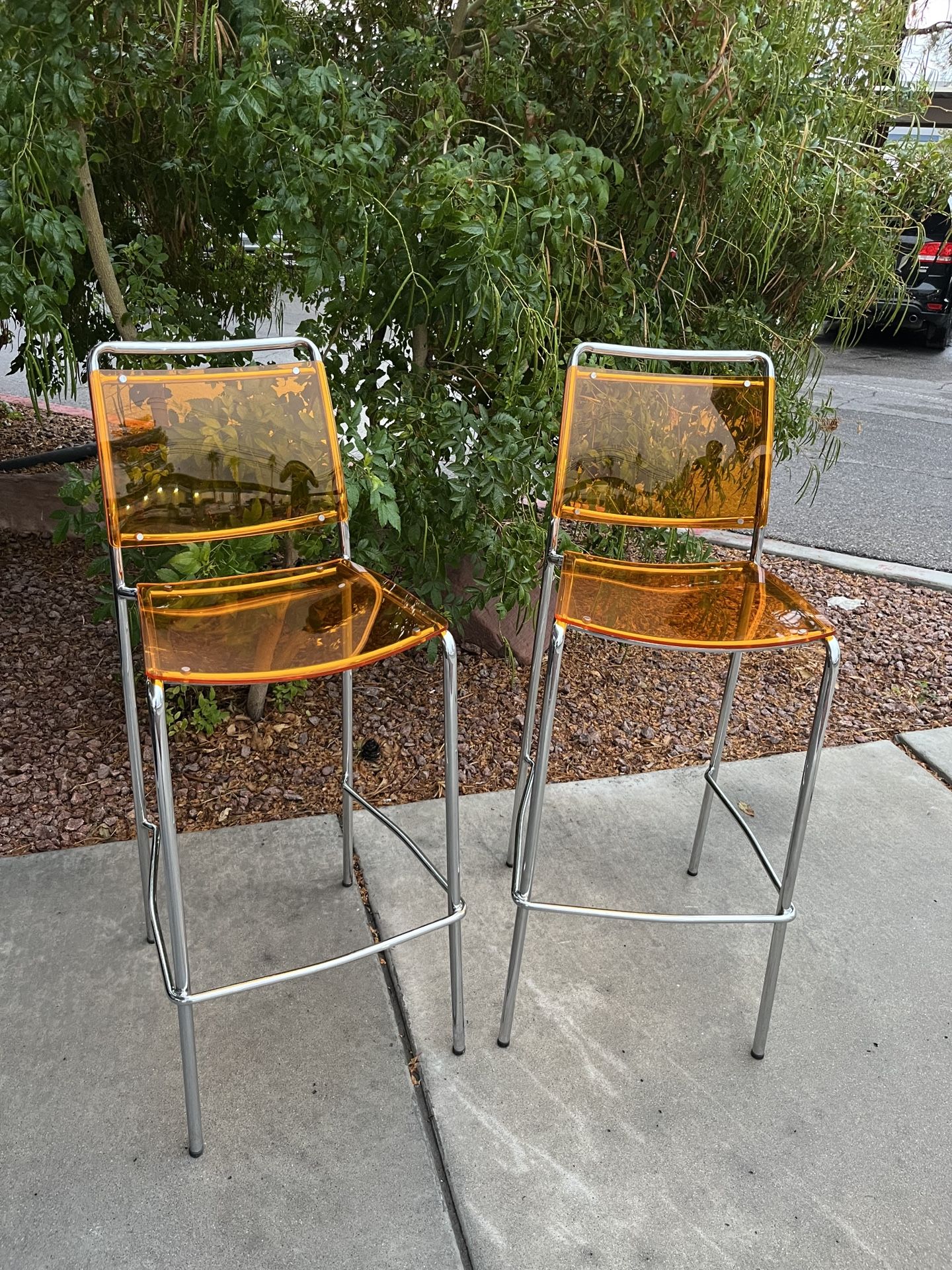 🍊 Eurostyle Orange Acrylic Bar Stools 🍊 $225 📏 30″ floor-to-seat height 🌿 Used, normal wear still in great condition 🧡 Bright orange 8mm acrylic seats & backs ✨ Sleek sculpted chromed-steel frame 🪑 Modern, lightweight, and stackable 🏡 Perfect pop of color for kitchen islands, bars, or workspaces