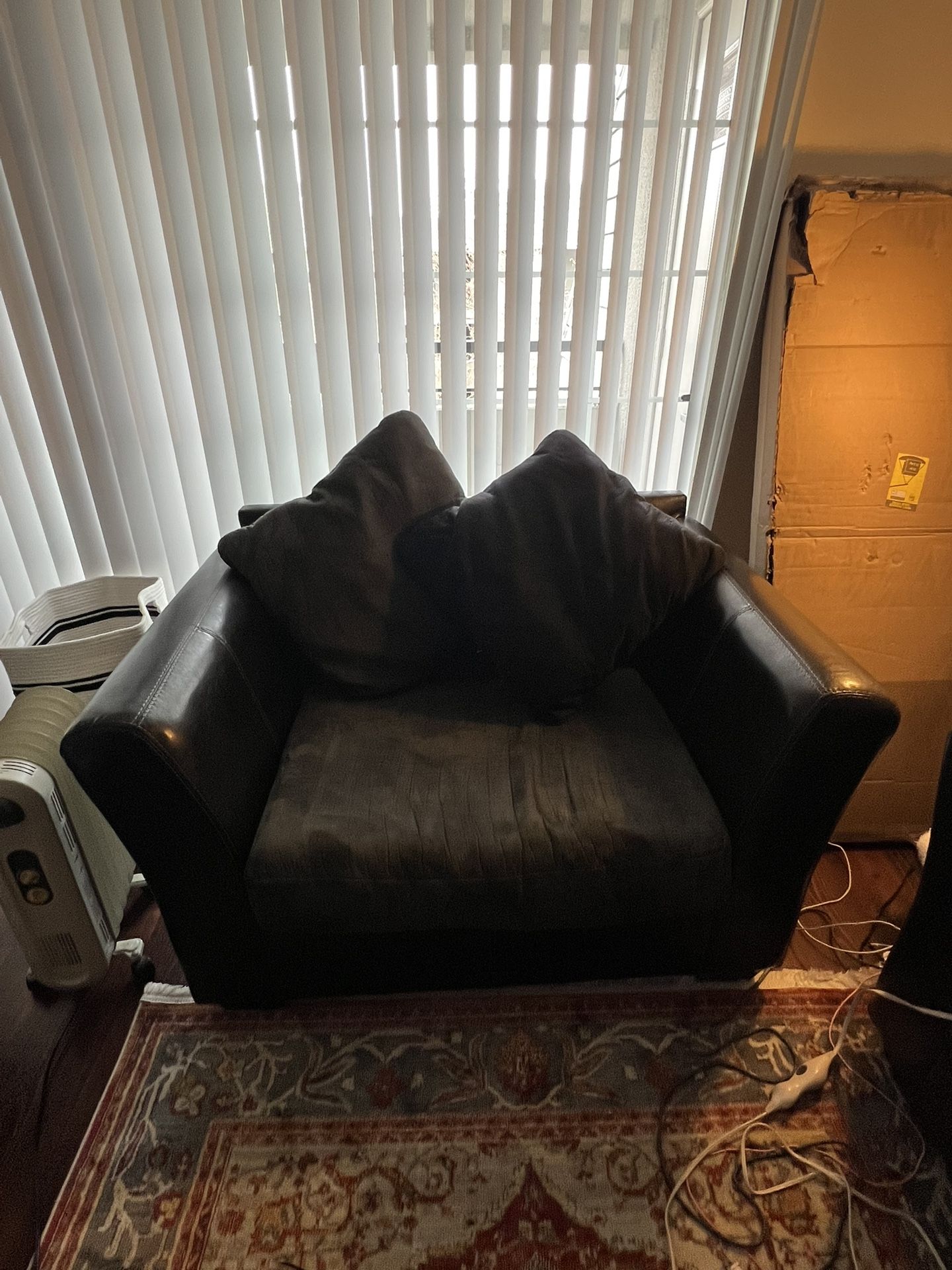 Free chair, you just come pick up in Walnut Creek. Dimension are 3 ft L x 4.5 ft W Nice back leather with velvet gray cushion. Very comfortable. Comes with free ottoman chair to rest your feet.
