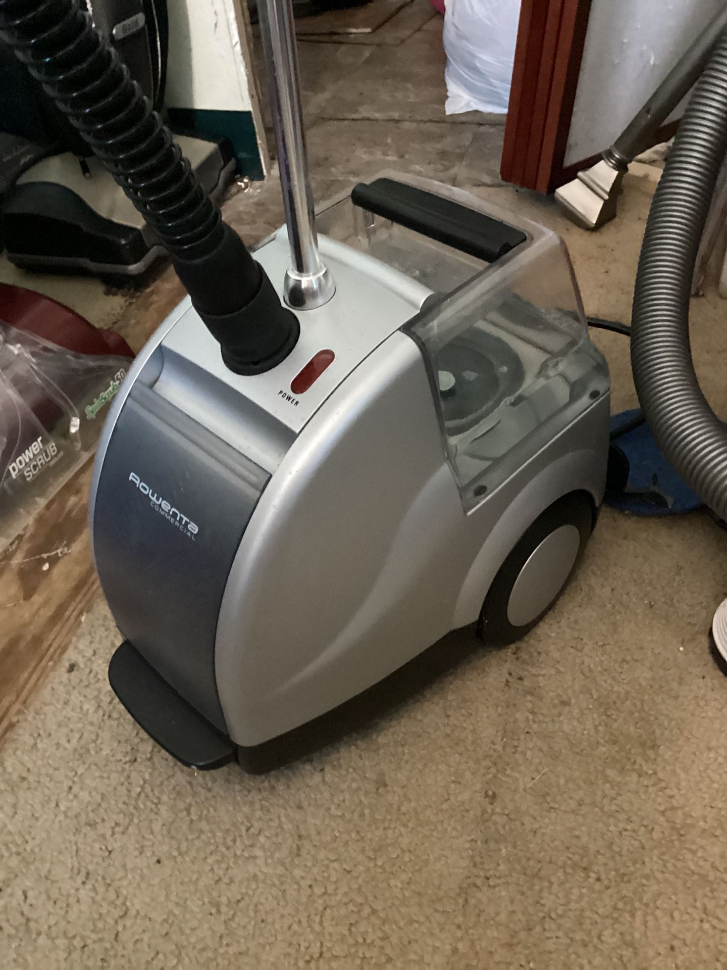large tank allows full steam for over an hour. Can adjust height of clothes hanger. Pulls around easily on wheels. Have known people to purchase for window film remover. Will demo before purchase.Pickup, West Lakeland with cash payment.