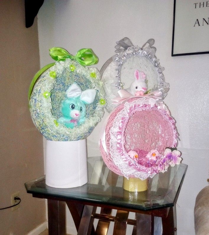 Beautiful, handmade, sting eggs. Eggs are appx 12"-14" tall x 8"-10" wide, each one comes with a stuffed animal or you and some Easter candy. They come in various colors, each one is one of a kind. Great Easter gift, must see to appreciate!