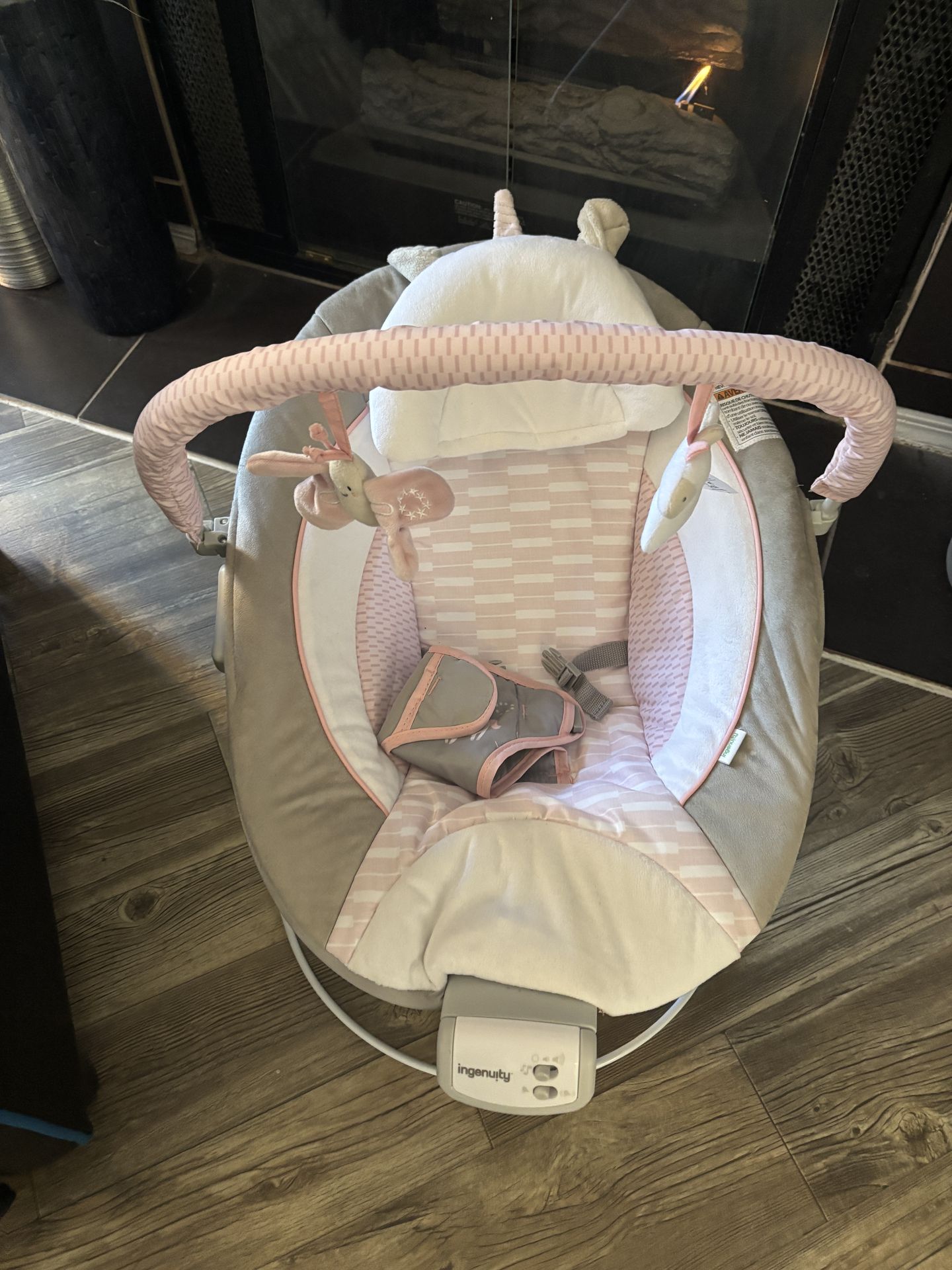 Ingenuity Soothing Baby Bouncer Infant Seat with Vibrations, -Toy Bar & Sounds, 0-6 Months Up to 20 lbs (Pink Flora the Unicorn)