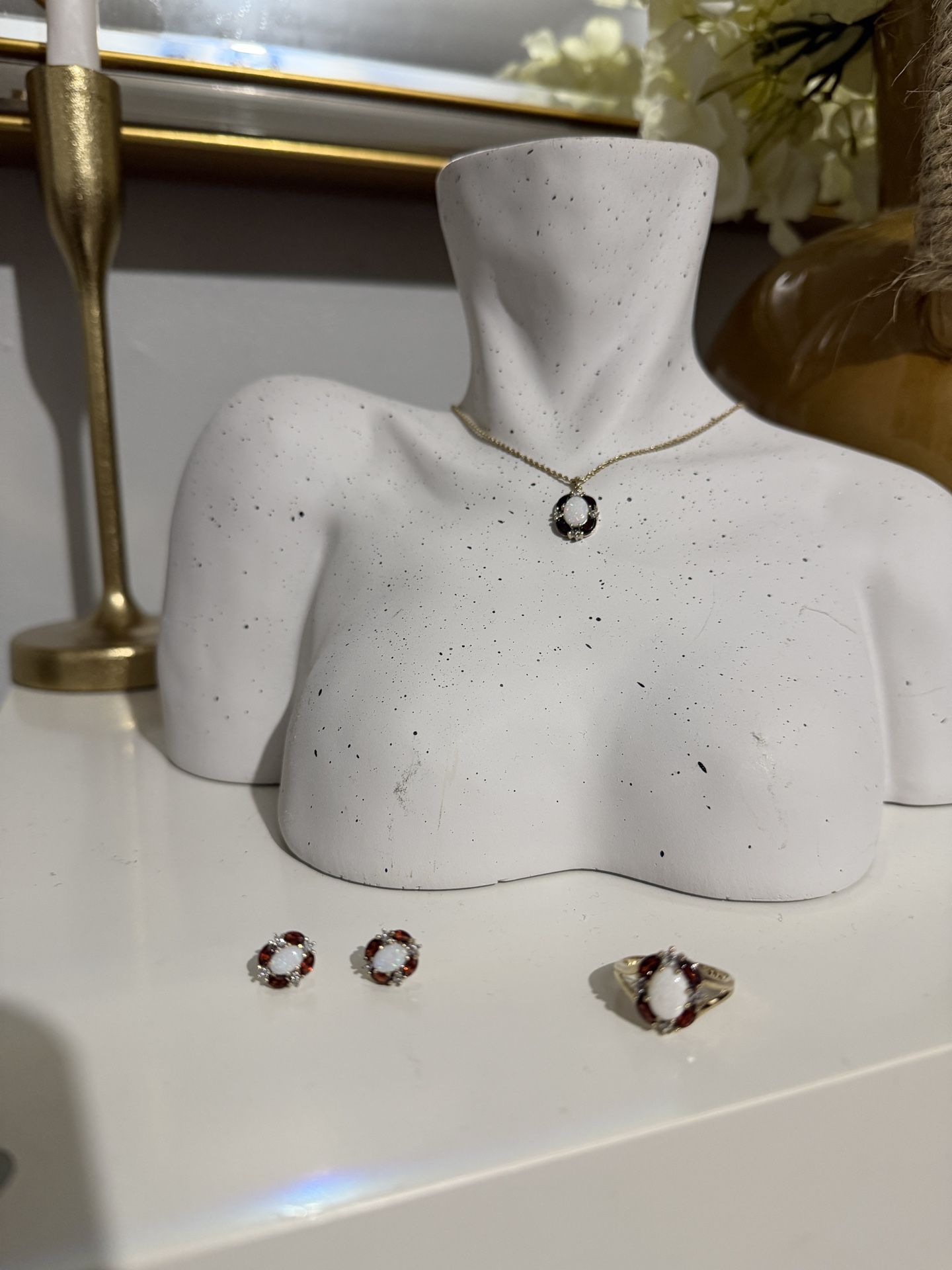 VINTAGE AJ 10k Gold Opal Garnet Diamond Jewelry Set Ring Necklace Earrings