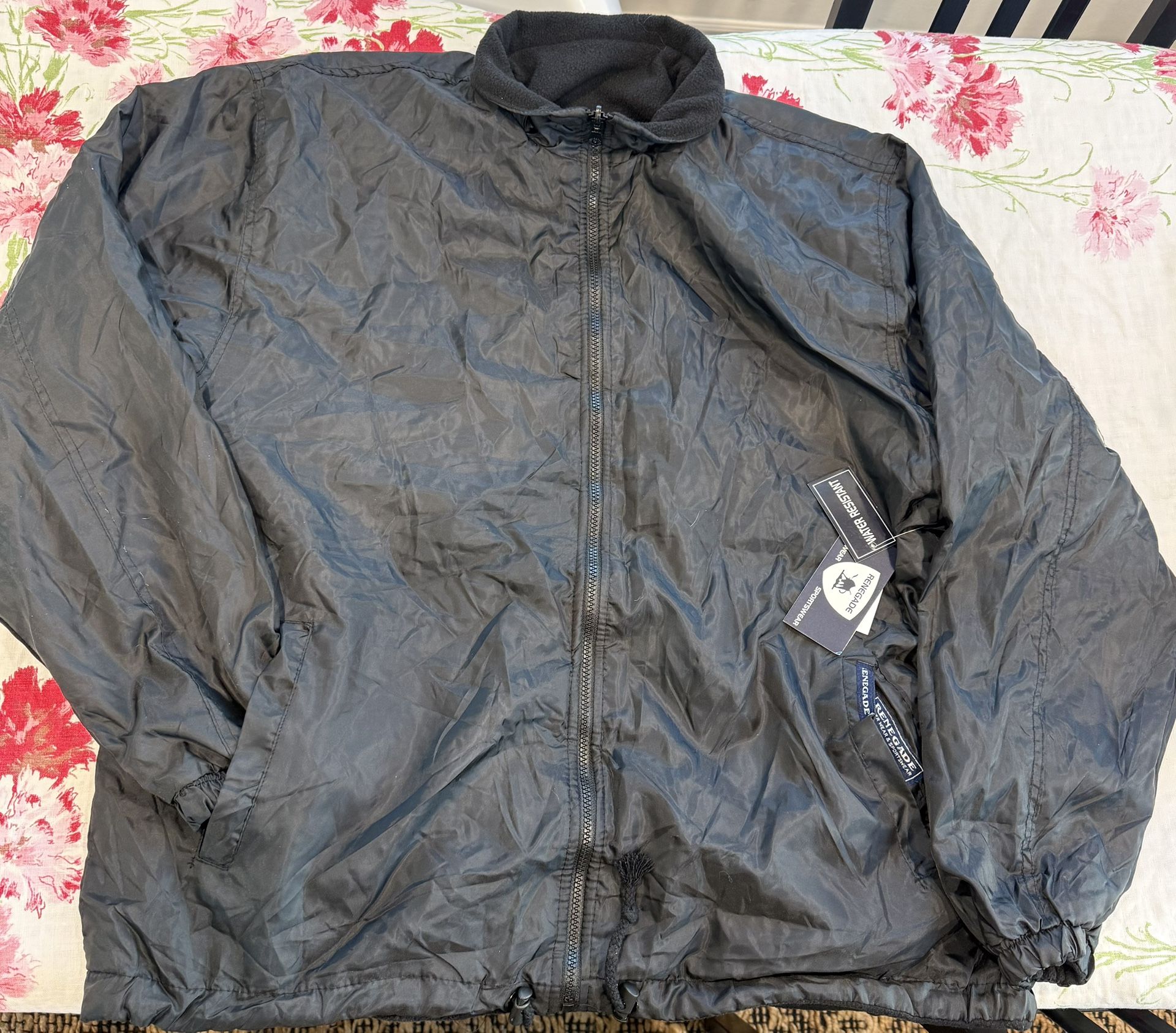 Renegade XL Black Water Resistant Windbreaker Jacket. Made of polyester with a solid black color, this mid-length jacket features a full zip closure, stand-up collar, and zipper accent. This jacket is also reversible! It does NOT have a hood. Brand new still with tags.