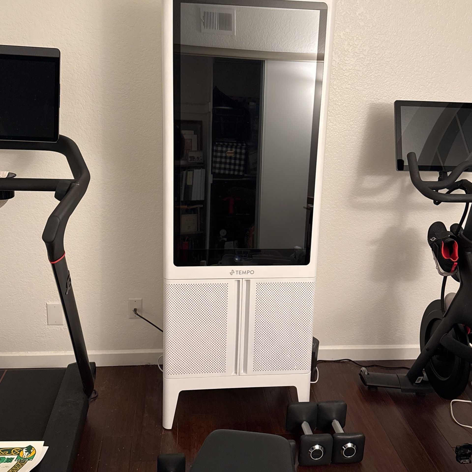 Tempo Studio, an AI-powered home gym with a 42” HD touchscreen, 3D motion sensors for form feedback, and included equipment (dumbbells, barbell, and weight plates). Access a variety of classes like strength, HIIT, and yoga. Note: A subscription service is required for personalized training and class access.