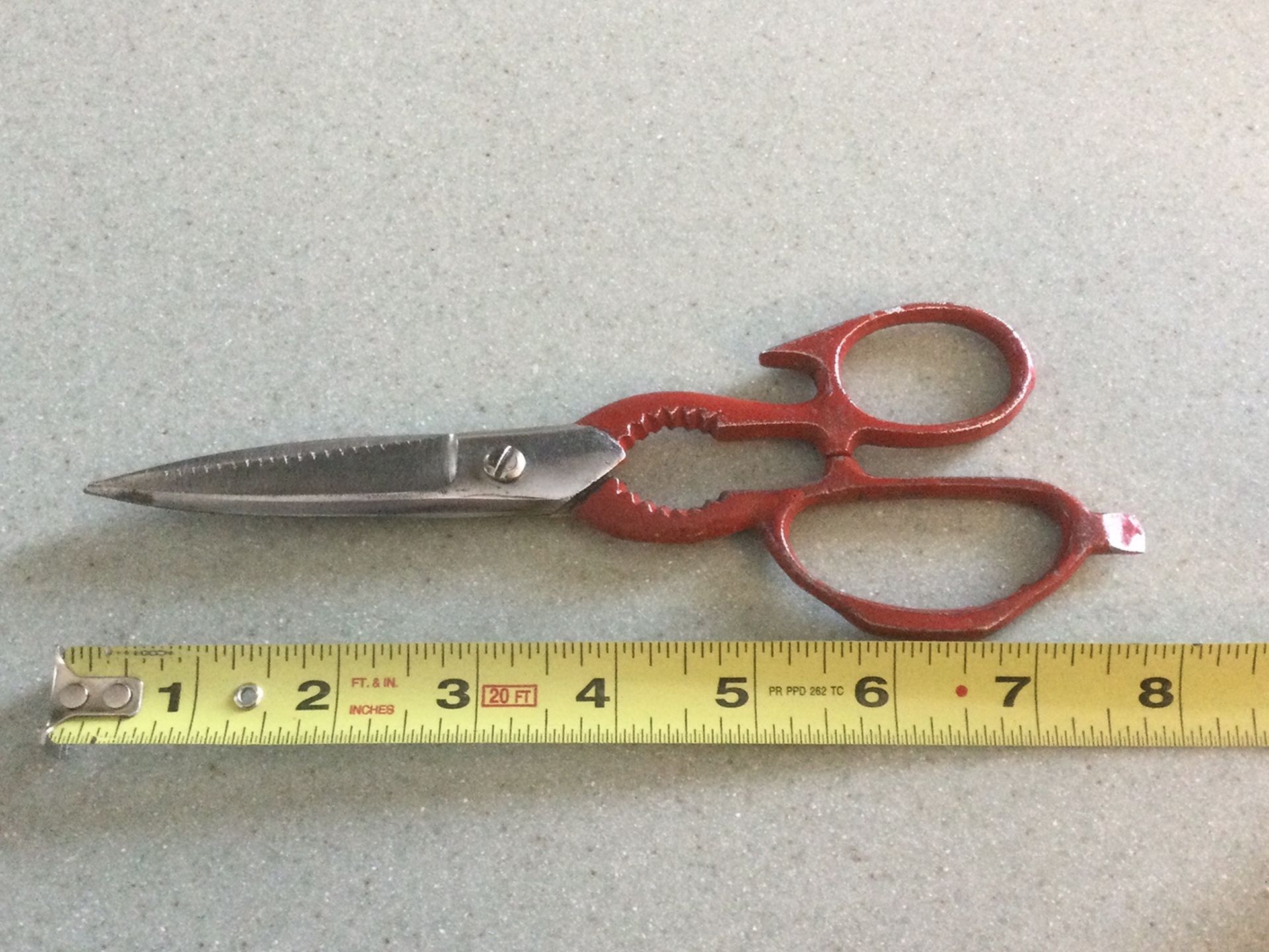 Antique red handle kitchen scissors,approx.8β long excellent working condition, nice usable antique.has built in screw driver and bottle opener, cool! Only$10! Wow ππ