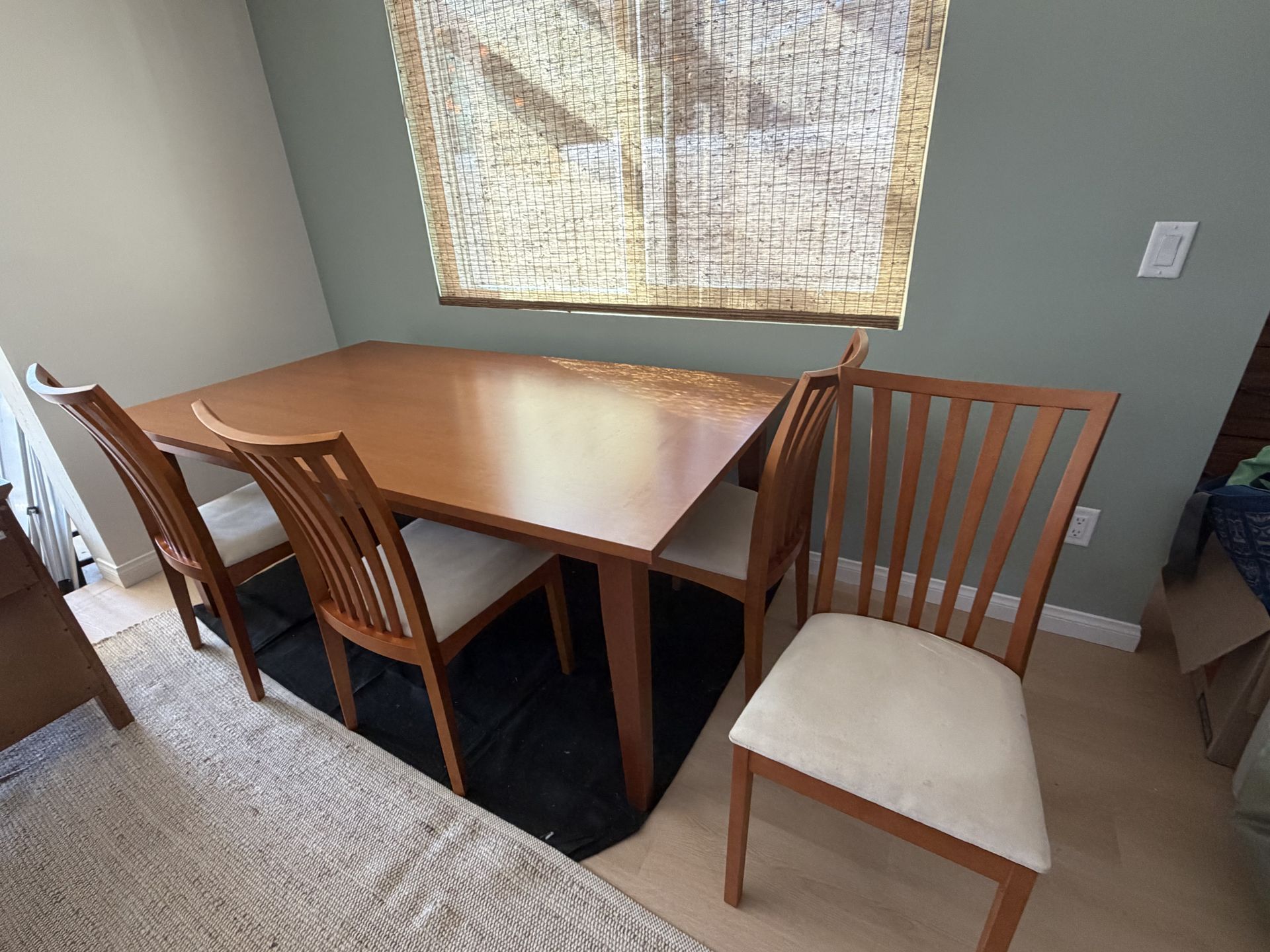 Beautiful solid wood dining table with 4 padded chairs. Table can comfortably seat 6 as is, and has an expansion panel to seat 8. Solid wood, Italian made, great condition. 72”L x 40”W x 30”H