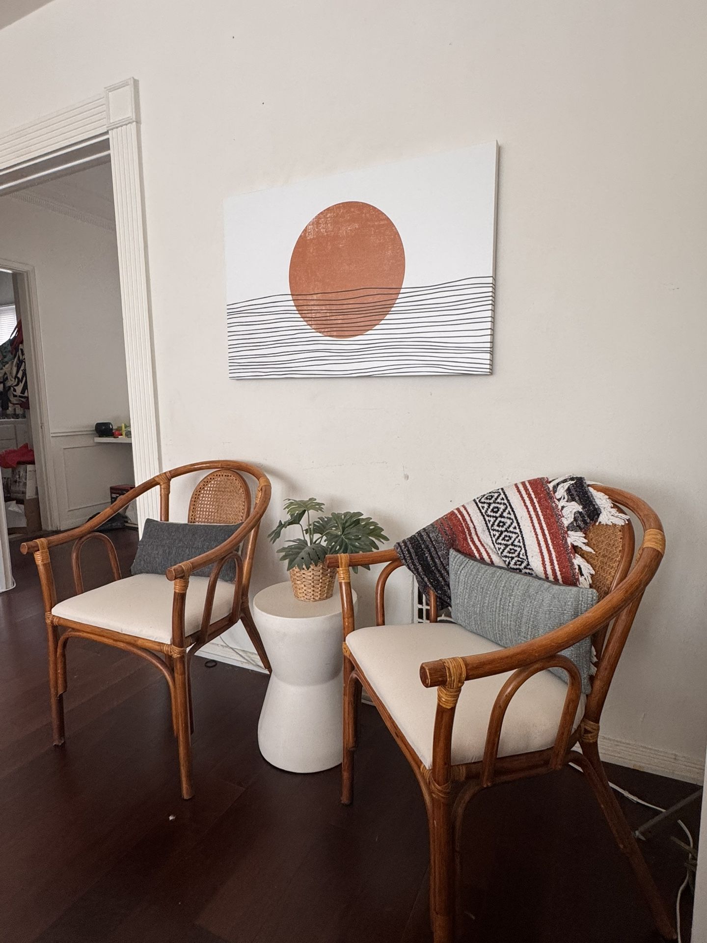 Selling this gorgeous coordinated furniture set perfect for creating a cozy reading nook or accent space! What’s included: ✨ 2 Matching Rattan Chairs - Stunning curved design with cane backs and cream cushions🖼️ Modern Abstract Sun Art Print - Terracotta/rust colored circle with flowing lines🏺 White Ceramic Plant Stand/Side Table - Perfect height between the chairs🌿 Small Potted Plant (as shown)🛋️ Decorative Throw Pillows - Gray textured and Southwest-style striped patterns Condition: Chairs: Excellent condition, very sturdy with beautiful wood grain Art: Like new, ready to hang Plant stand: Perfect condition Pillows: Clean and well-maintained Details: -Chairs have comfortable padded seats and backs -Classic mid-century modern rattan/bamboo style -Colors coordinate beautifully: warm wood tones, cream, terracotta, and gray Perfect for apartment, living room, bedroom, or sunroom. Must sell as complete set - moving soon! 💰 Asking $280 for everything (retail value $500+)📍 Cash only, pickup required📱 Serious inquiries only - can deliver within 10 miles for extra $20