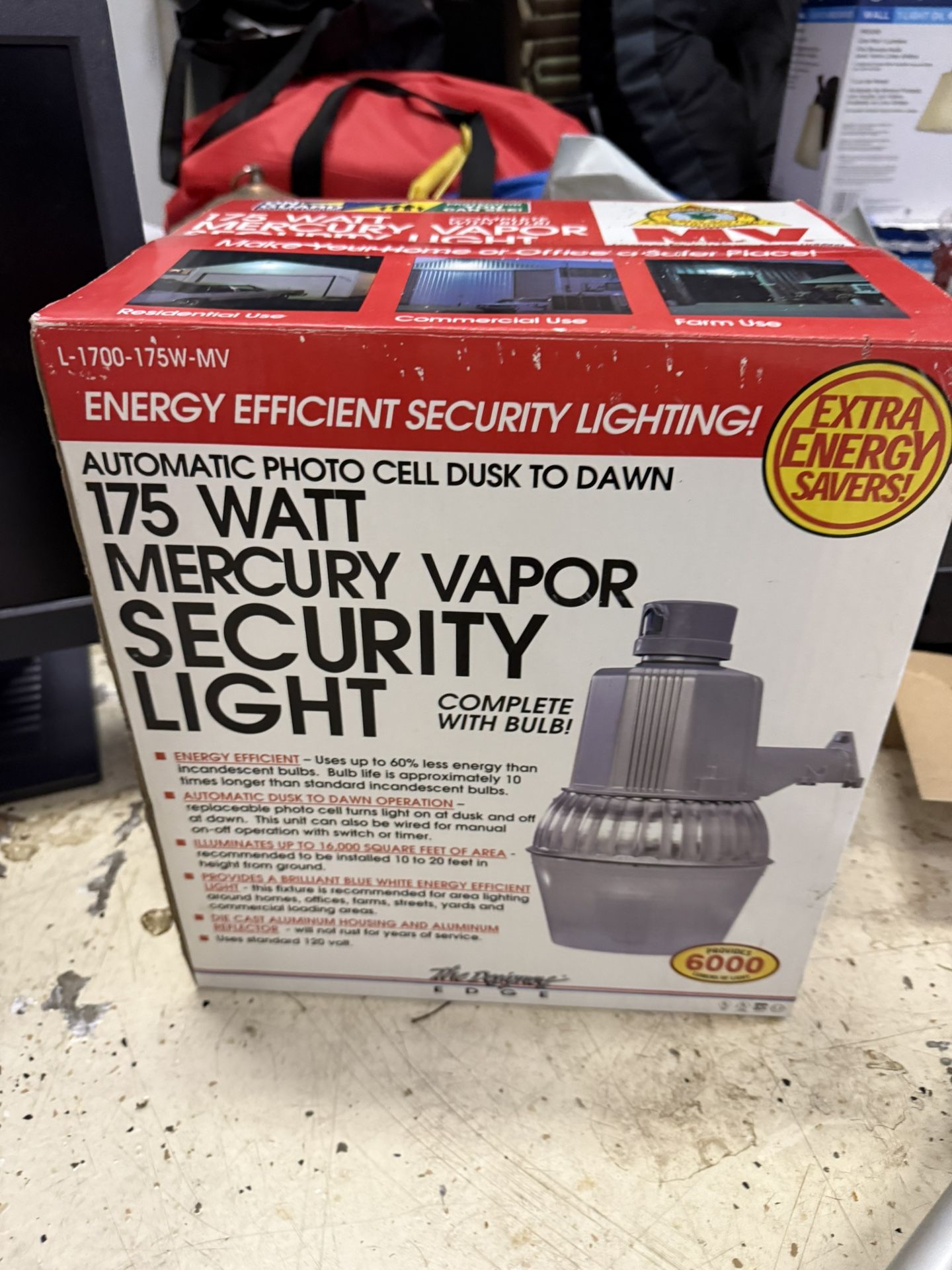 Mercury vapor security light. 175 W. Brand new and still in the box. Never been used. Includes a light.