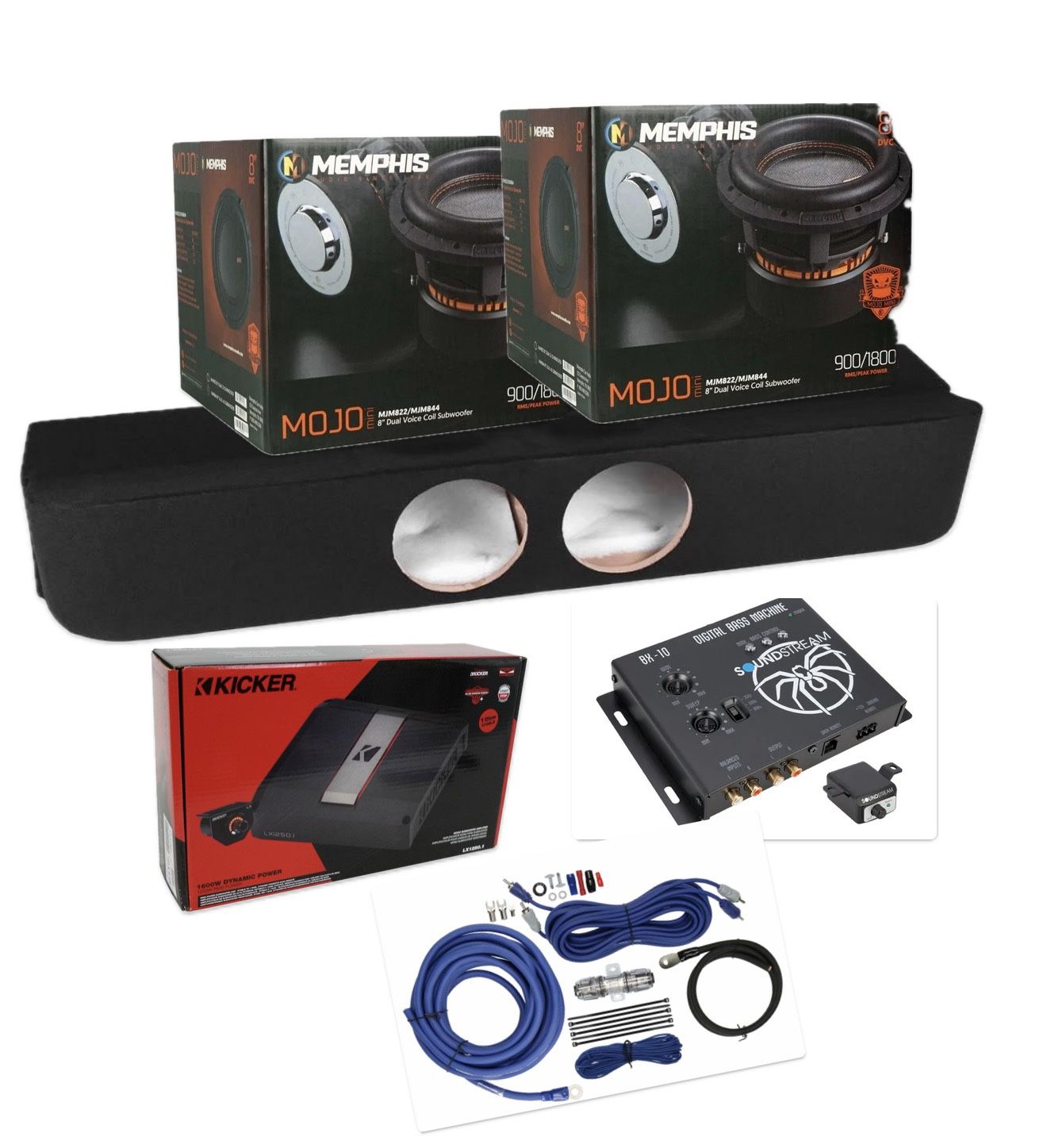 $1700 Firm New Installed Fit on FORD F150 250 and 350 from 2017-2026 crew cabs CHEVY SILVERADO OR GMC SIERRA from 2007 to 2026 crew cabs 2 MEMPHIS MOJO 8” SUBWOOFERS 3600 watts 1800 rms powerful subwoofers Ported box Kicker lx series amplifier Bass epicenter Amp kit wires 0” Installed Keywords alpine kenwood kicker pioneer Rockford Memphis mtx jl audio hifonics sundown audio skar audio ds18
