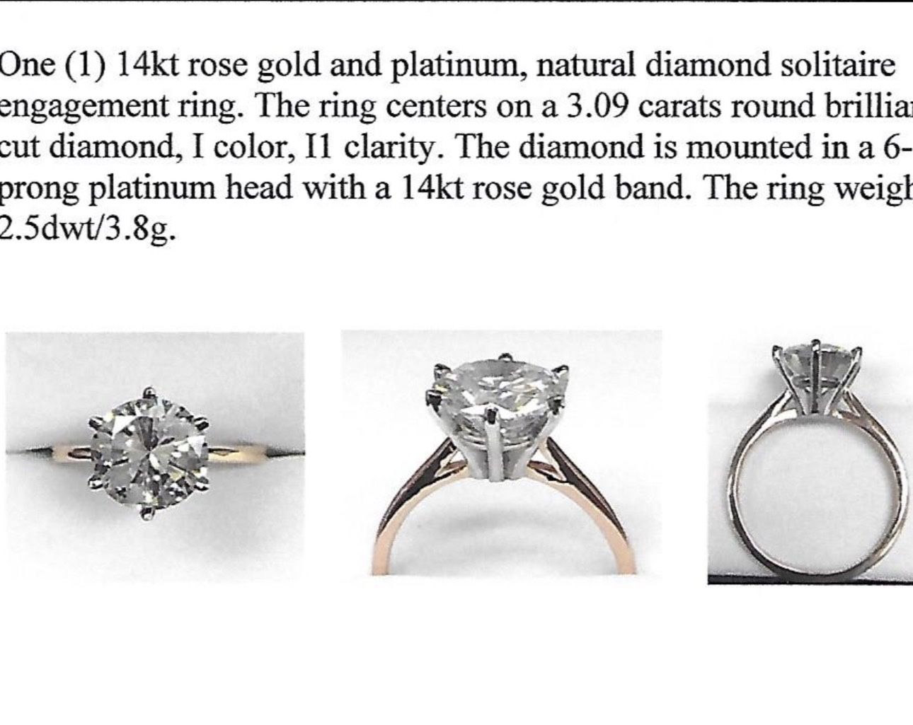 14kt rose gold and platinum, natural diamond solitaire engagement ring. The ring centers on a 3.09 carats round brilliant cut diamond, I color, Il clarity. The diamond is mounted i n a 6- prong platinum head with a 14kt rose gold band. The ring weighs 2.5dwt/3.8g. Appraisal is for $57,430 (which I’m happy to share) Asking price: $50,000 You’re also saving thousands in sales tax as well so it’s well over $10k in savings. I do have a diamond tester to prove authenticity. Serious inquiries only please.