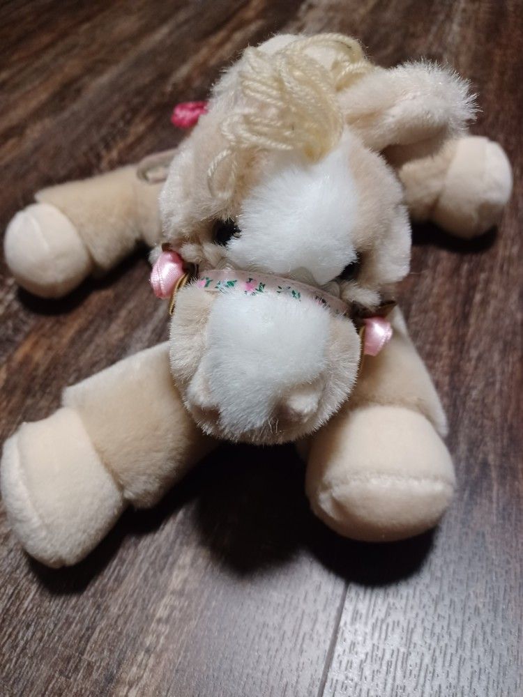 Super Cute Plush Pony Soft & Very New Looking Pre-owned No stains, No smells, No crusty spots About 10 inches long x 6.5 inches tall x 3.5 inches wide Has a velcro belly with 2 small boxes inside. One in the neck and one in his belly. (music?) I have no clue how it works. *Smoke-Free Home