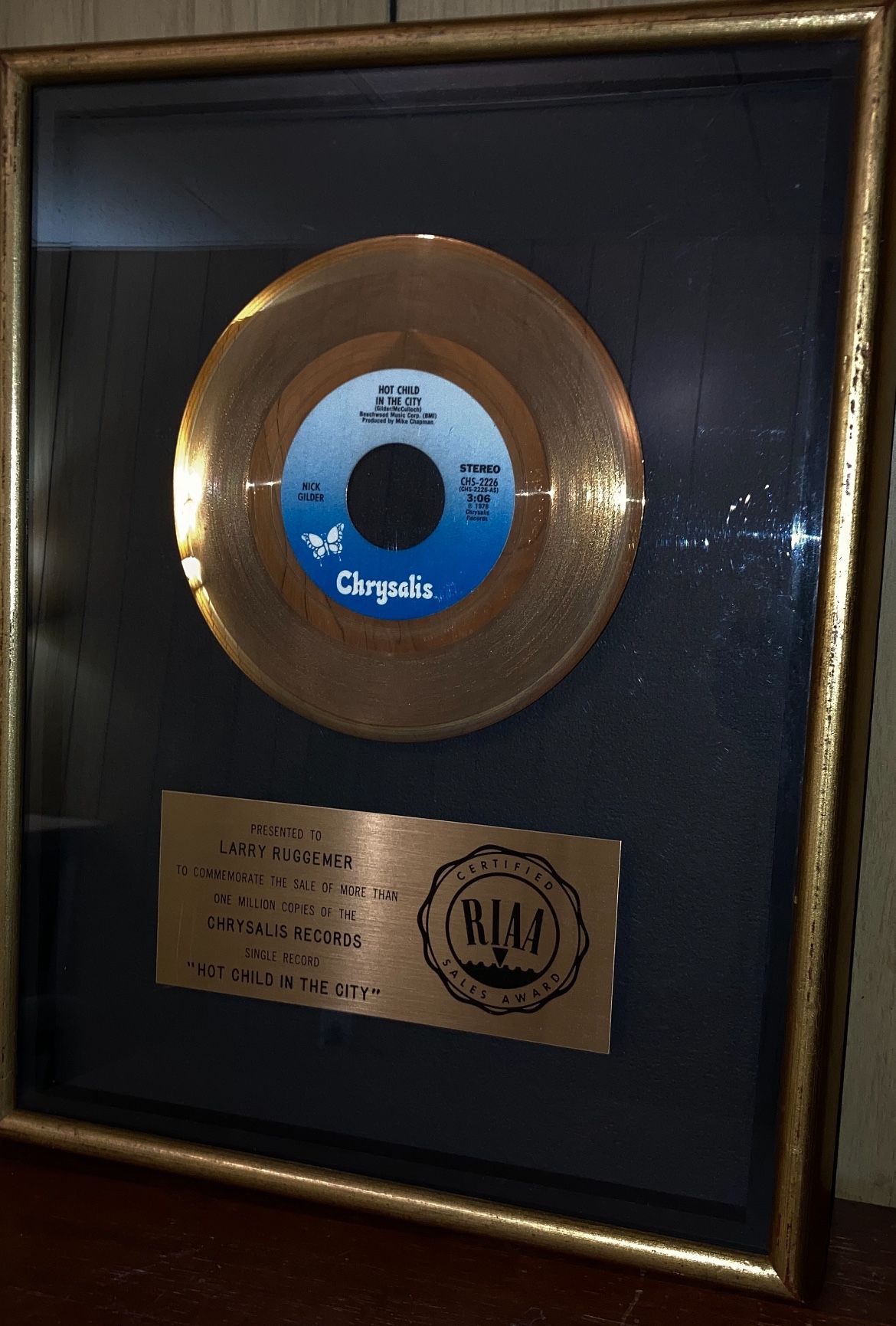 This is a first presentation RIAA Gold award that would have been manufactured in 1979 making the award 46 years old. It is presented to Larry Ruggemer, who was apart of a radio and record promotion record industry publication or company. • RIAA "floater" awards numbered only 25-50 plaques worldwide for any given single/album • Award measures 13" x 17" • Fantastic collector's item Known as a "floater" award because the components appear to "float" above the matte, they were made from 1(contact info removed) The award is in Very Good condition with original internals. The frame has some expected wea matte has minor fading. More info: RIAA Gold Single award for Nick Gilder's "Hot Child In The City", which was released on June 12, 1978 and certified Gold by the RIAA on Sept. 29, 1978 for 500,000 copies sold. The track went to #1 on the Billboard Hot 100 chart and also in Canada in 1978. It is from the English-Canadian's album City Nights and was actually his second #1 Canadian single, that being "Roxy Roller" which he recorded as lead singer of the group Sweeney Todd. Gilder won two Juno Awards in 1979 for "Single Of The Year" and "Most Promising Male Vocalist Of The Year." Gilder went on to release more material and also wrote tracks for Pat Benatar, Scandal ft. Patty Smyth, Joe Cocker and others. By 1979 the single was certified Platinum by the RIAA for 1 million sold.