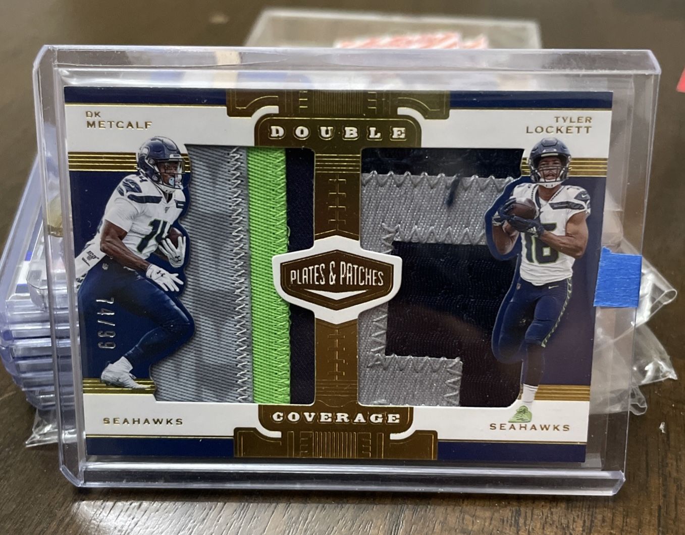 2019 Panini Plates & Patches DK Metcalf / Tyler Lockett Double Coverage Dual Patch Triple Color Patch Numbered /99 Beautiful multi-color patch combination Two Seattle Seahawks stars on one card Low-numbered collectible Great eye appeal for Seahawks or Metcalf collectors Card is in excellent condition and will be: ✔️ Sleeved ✔️ Toploaded ✔️ Shipped securely with tracking Perfect addition to any Seahawks PC or NFL patch collection.