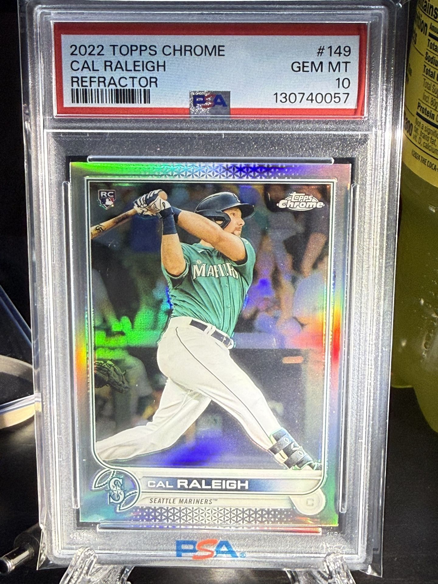 For sale is a 2022 Topps Chrome Cal Raleigh Refractor Rookie, professionally graded PSA 10 GEM MINT. ✔ Rookie Card ✔ Topps Chrome Refractor ✔ PSA 10 (Gem Mint) ✔ Seattle Mariners franchise catcher ✔ One of the cleanest modern Cal Raleigh rookies you can own Cal Raleigh has established himself as one of the premier power-hitting catchers in baseball and a cornerstone of the Mariners. Chrome Refractor rookies in PSA 10 are getting tougher to find as collectors lock these up.