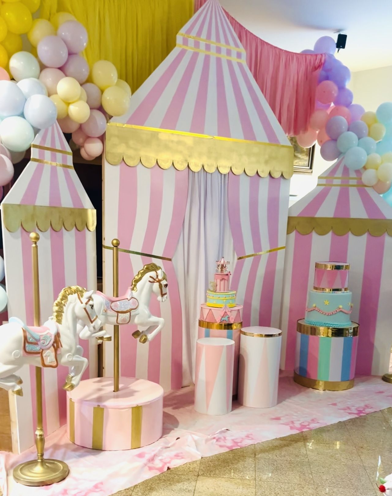 Carnival/ circus tent Backdrop, carousel horses, madd hatter hats, animal cage and many more. Msg fir more info