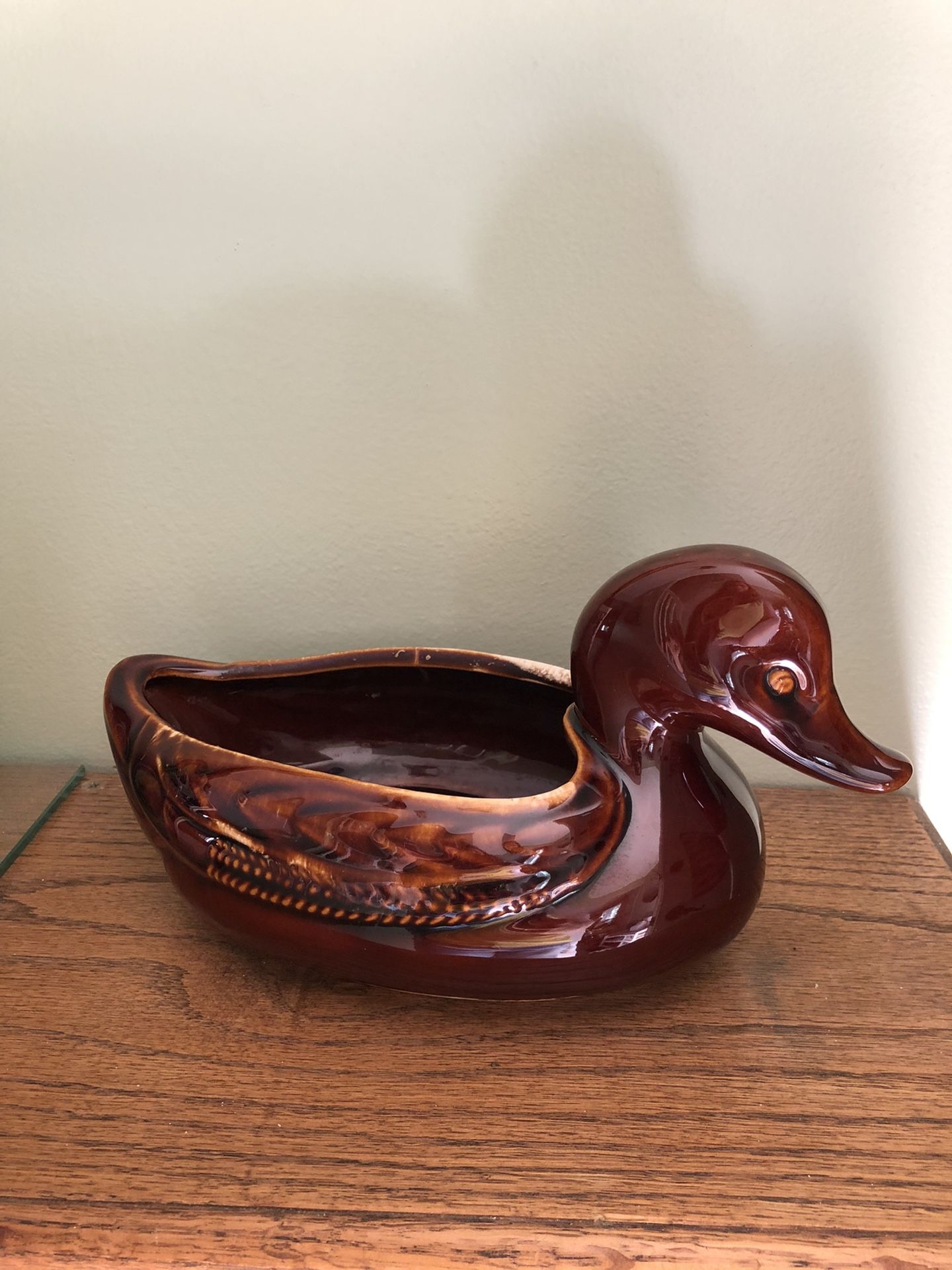 Brown Drip Edge Duck Planter. Number F6O. Measures about 10" at longest point, 4.5" at widest point and about 5" high. In great condition with exception of barely noticeable .75” crack. Made in the USA. Weighs 2lbs