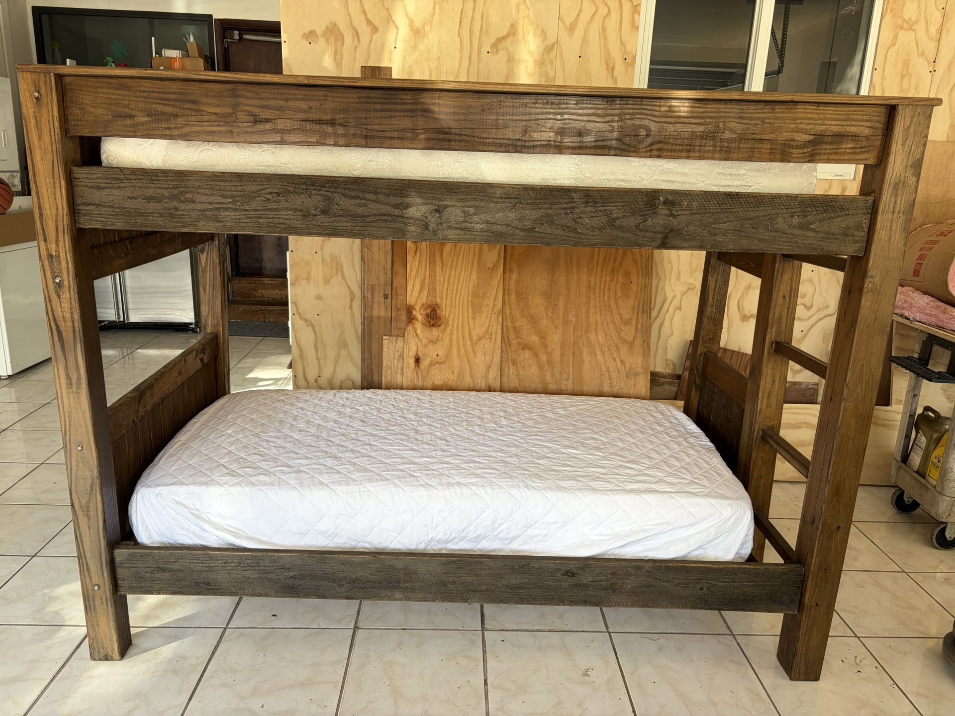 Custom made bunk bed (solid wood) Two virtually new mattresses included Assembles and disassembles in minutes Guides and hardware included