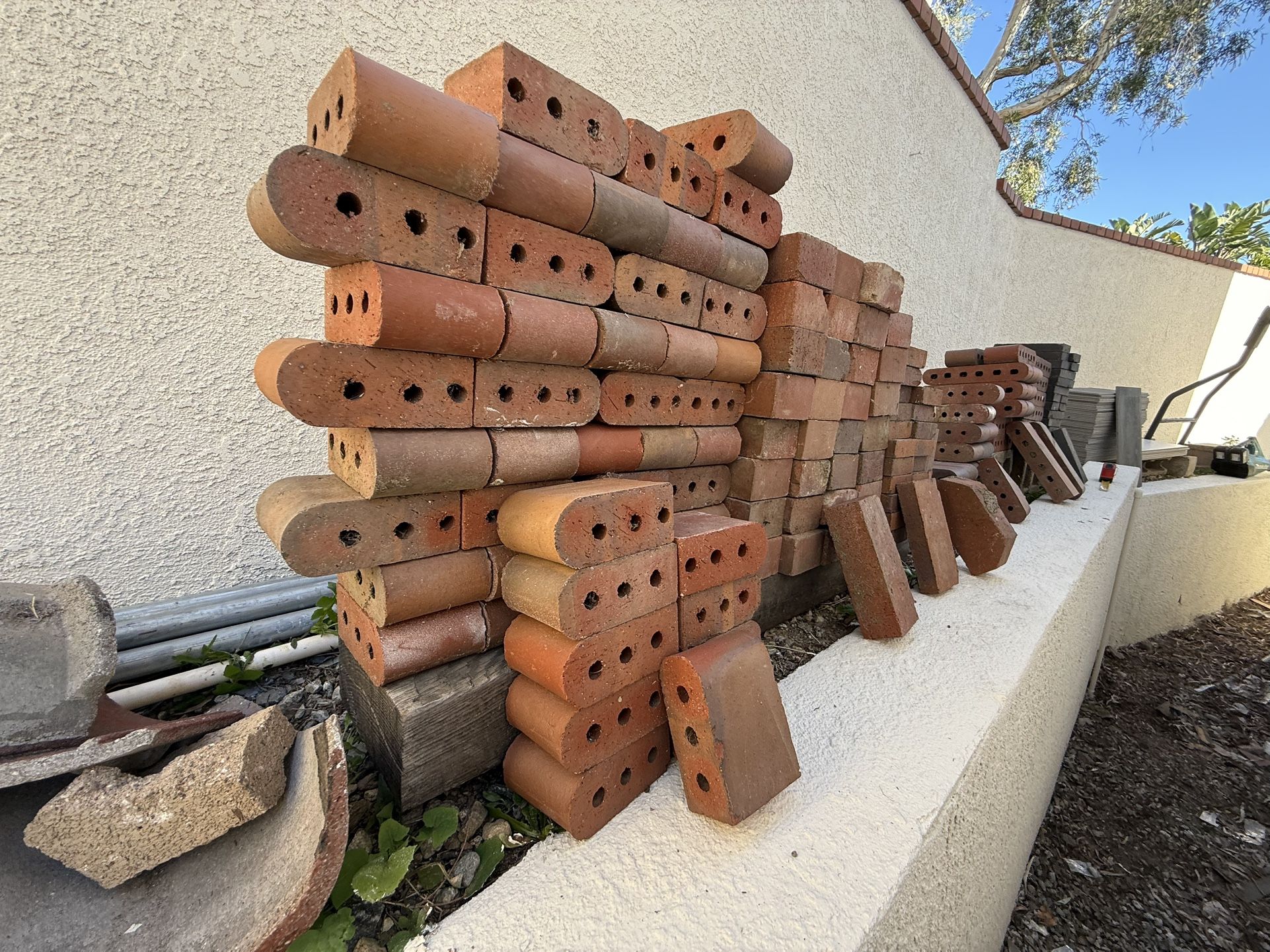 Various sizes and types of brick and tile. Please take a look at all of the pictures. There are various sizes of regular bricks and bull nose. The black bricks are specifically made for fire as in a fire pit. The tiles are 12”x24”. There are 43 Gray tiles and six of the white. $100.00