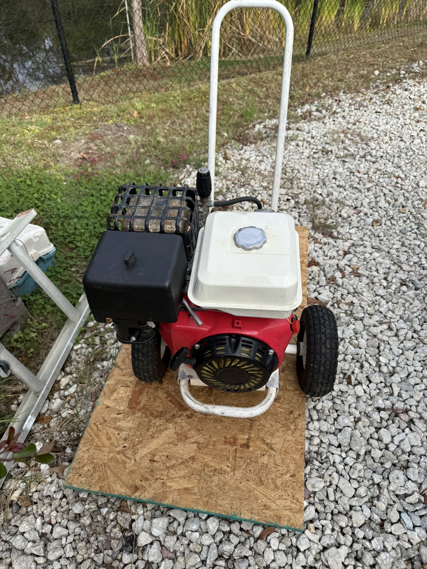 Honda motor , Cat pump 4.0 GPM 4200PSI Comes with machine 15 in ryobi surface cleaner ( gun attachment) 3 guns 2 hoses for pressure washer ( non quick connect ) Quick connect fittings No garden hose but i have one to show it works Works great just done use it anymore