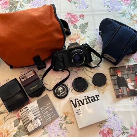 Manufactured in the 1980’s, this vintage CANON T50 35mm SLR film camera was released as “Official 35mm Camera” of the 1984 Olympic Summer Games in Los Angeles and has the original cover cap design. Great for the upcoming LA Olympics! This set comes with: Canon T50 35mm Film Camera with strap, Canon 50mm FD 1:1.8 lens and caps, Canon Speedlite 244T flash and case, Genuine Canon camera shell case, Larger soft carry bag, Vivitar filter, and original instruction manuals for the camera and flash. Camera battery tested and working. Contact cover is missing on flash. Sold AS IS. Film and batteries not included. Perfect for the beginner photographer!