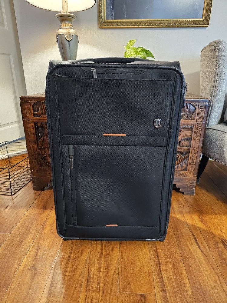 -Lg checked luggage -very good condition -28x17.5x10 +2" Gusset -Expandable up to 2" -Low profile carry handles -3 exterior compartments -2 interior lid pockets -2 interior lid pockets -Adjustable hold down straps - Protective side guards for max. protection -Used 2x, in very good condition