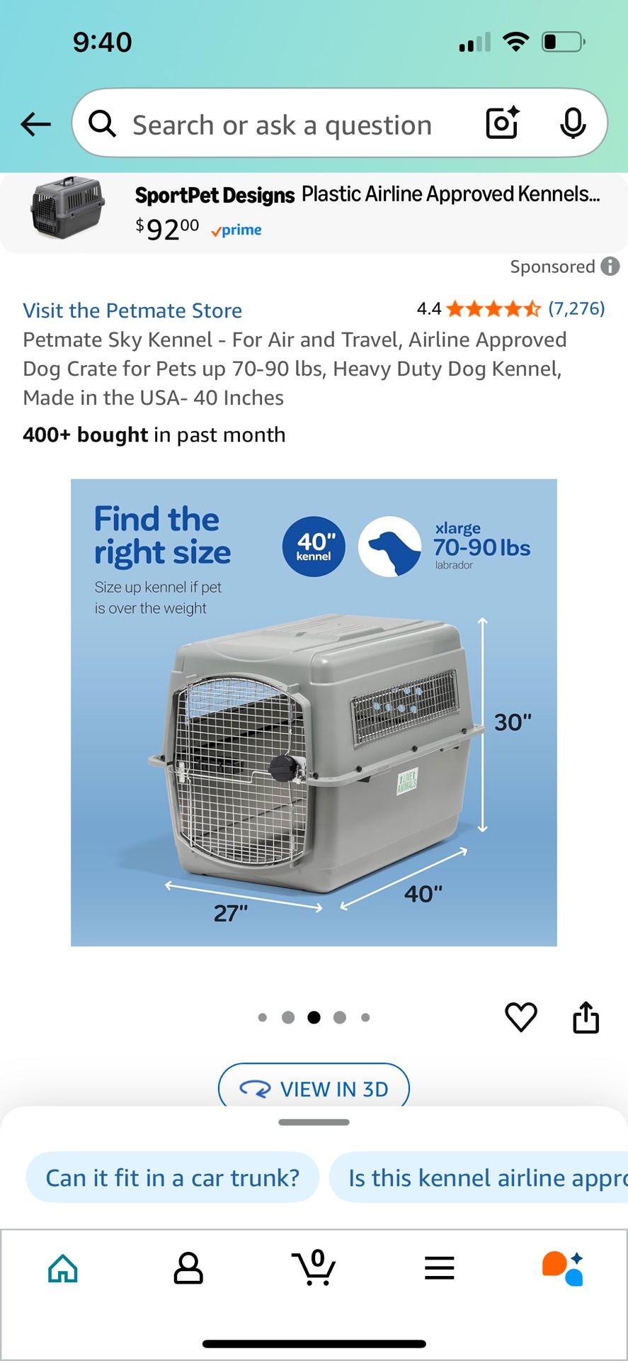 Pet mate skykennel 40 inch 70-90 lbs Dimensions 40"L x 27"W x 30"H $100 OBO. Cash only. Pick up in airway heights.