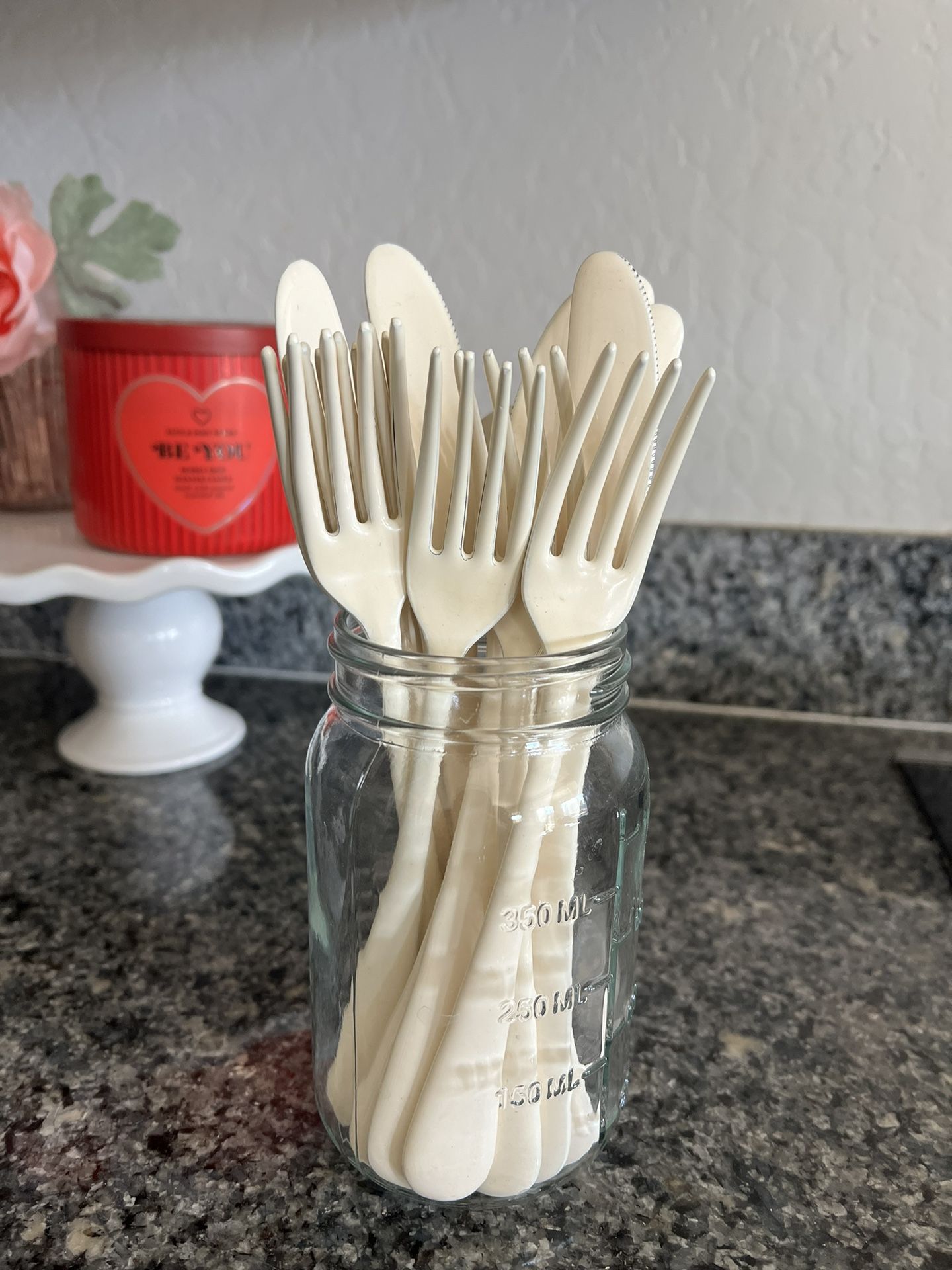 Brand new cream colored silverware. Almost looks hand painted. There are 6 forks, 6 butter knife’s and 1 spoon. Mason jar not included. Asking$ 12 will accept cash or Venmo