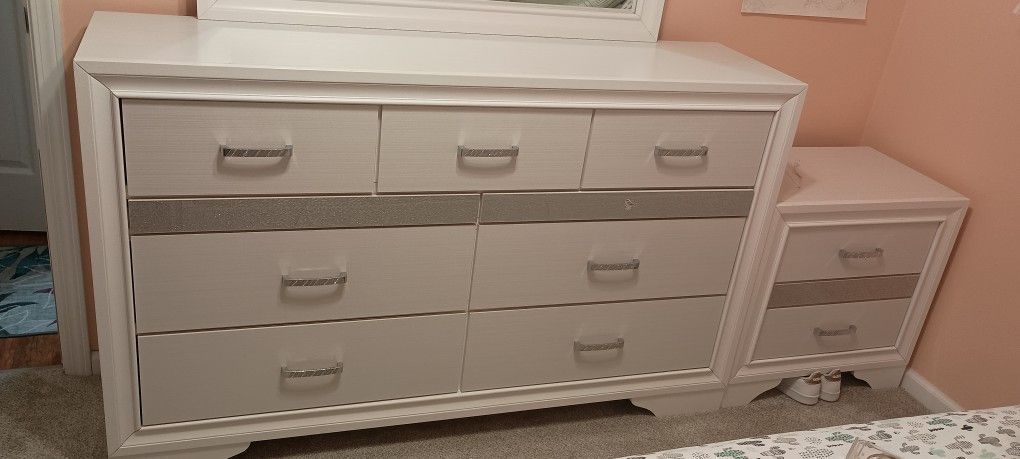 Bedroom set, White queen size bed frame, dresser with mirror queen size bed frame headboard and two drawers plus one night stand