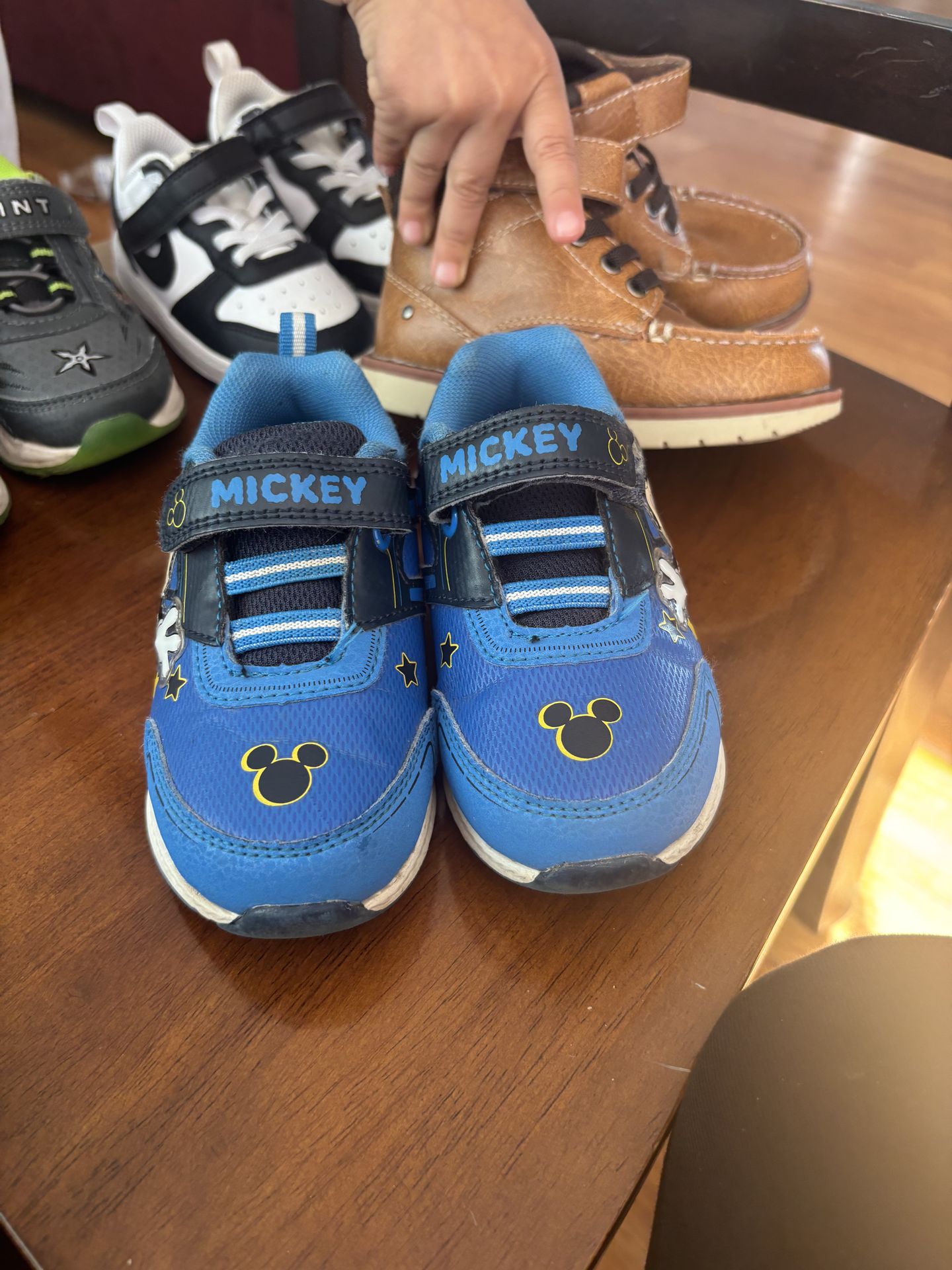Boy toddler shoes take all for 75$ Grey Jordan’s 20$ size 9 Red and black Jordan’s 20$ size 8 Blue Mickey 10$ size 9 Ninja turtle 10$ size 8 Boots 10$ size 8-9 Black and white nike 10$ size 8 In great condition