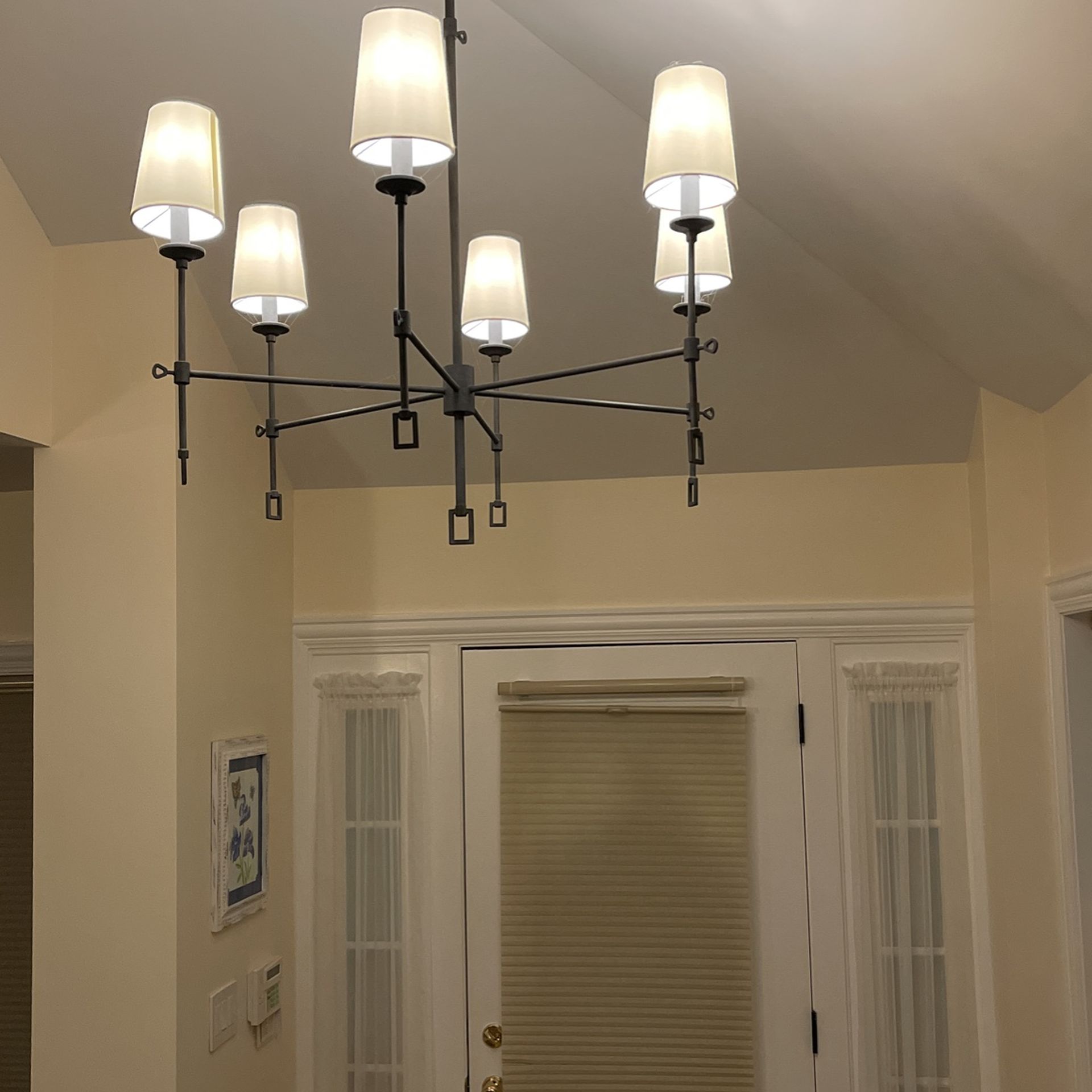 Brand new in the box black oxidized 4 lamp Chandelier. See descriptive photo, 6 lamp Chandelier photo taken for visual only