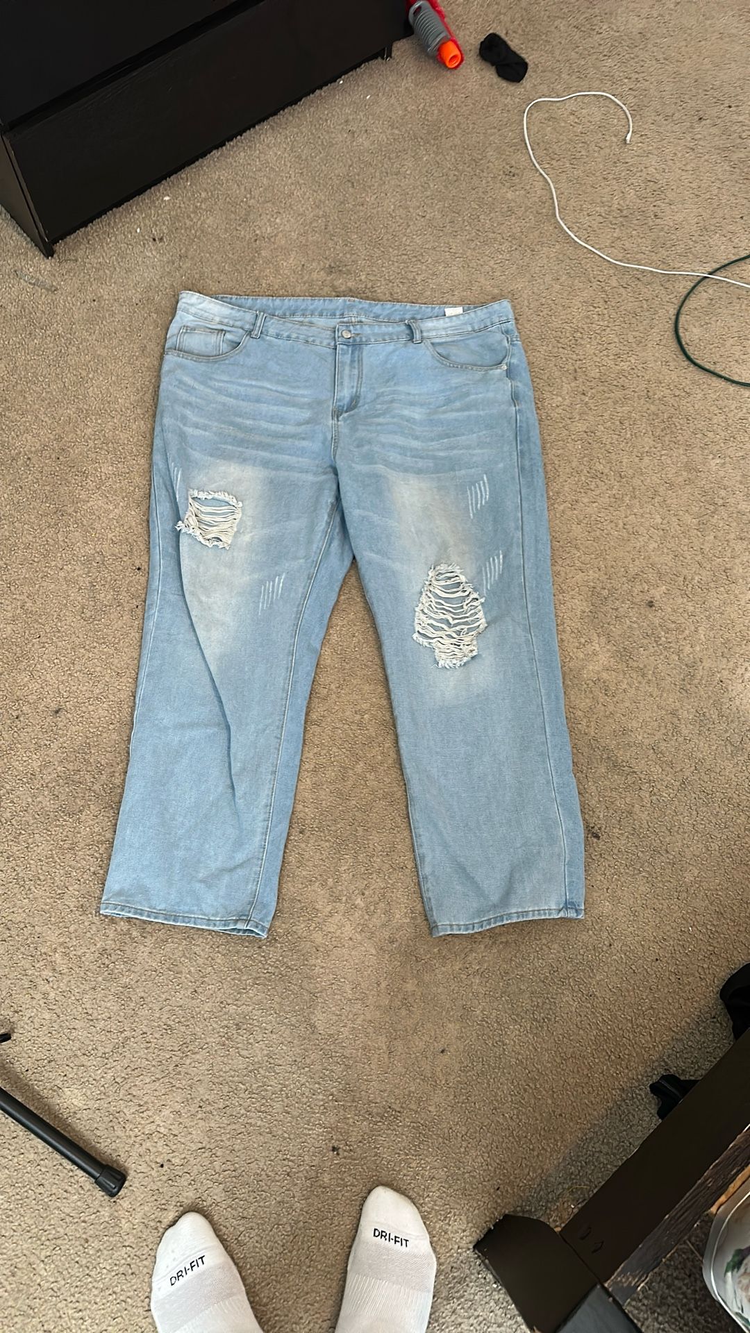GALLERY FADE Men Plus Ripped Frayed Straight Leg Jeans, Plain Long Baggy Light Blue Washed Cargo Jeans,