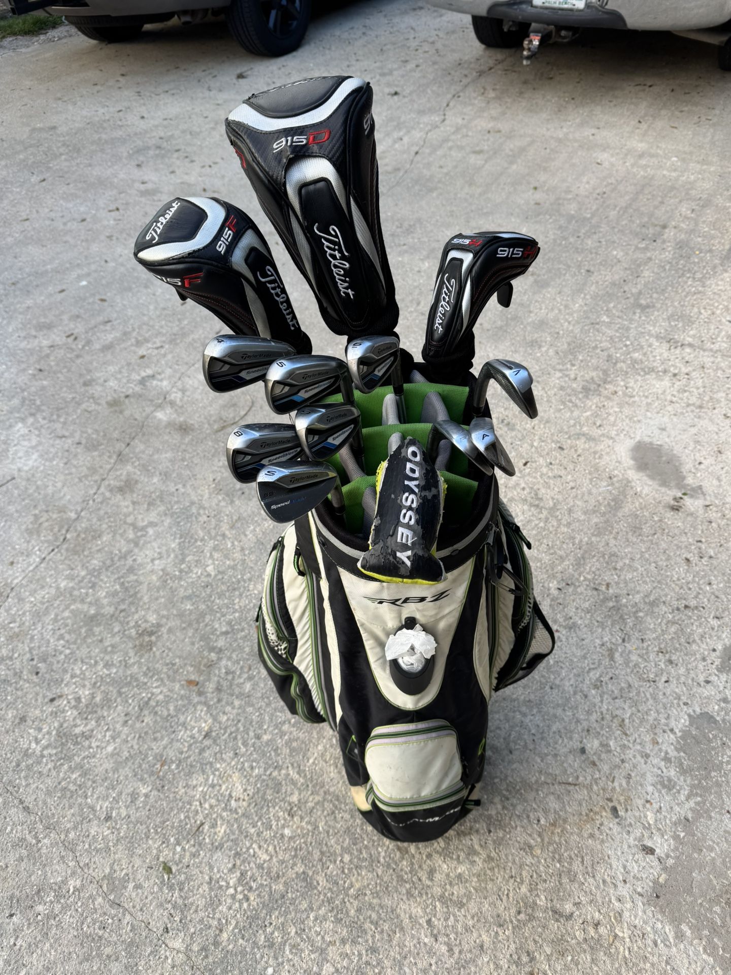Titleist: Driver Fairway Rescue 5 iron Taylormade: 4,5,6,7,8,9,P,A,S Putter: Odyssey 330m metal X milled with extra weights and tool Bag included