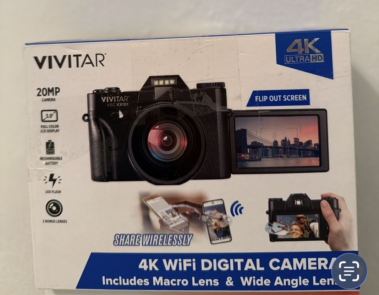 Vivitar 4K Ultra HD WiFi Digital Camera, 20MP Vlogging Kit with Flip Out Screen. This versatile camera setup includes a 3.0" full color LCD display that flips out, making it perfect for vloggers and selfie enthusiasts. Key Features: - 20.0 Megapixel sensor with 16X digital zoom. - 4K Ultra High Definition video recording. - WiFi connectivity for easy wireless sharing. - Includes 2 bonus lenses: Macro Lens and Wide Angle Lens. - Accessories included: Carry case, 32GB memory card, rechargeable battery, and Type-C USB cable.