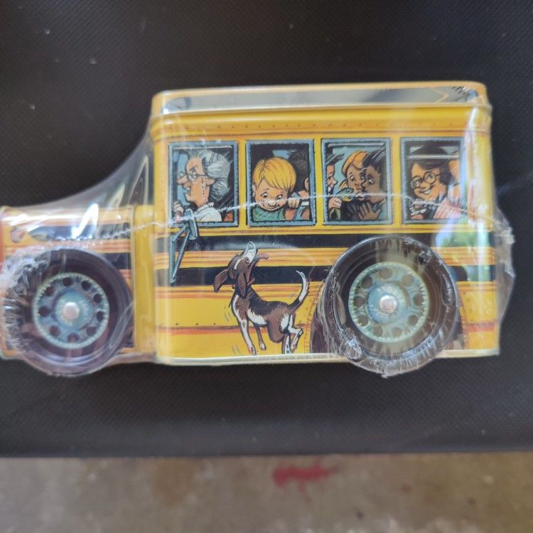 Vintage tin yellow school bus bank and storage cubby with moving wheels. It is made of durable tin and features a classic yellow school bus design. The bus has moving wheels and can be used as a coin bank or for storage. New in original sealed packaging