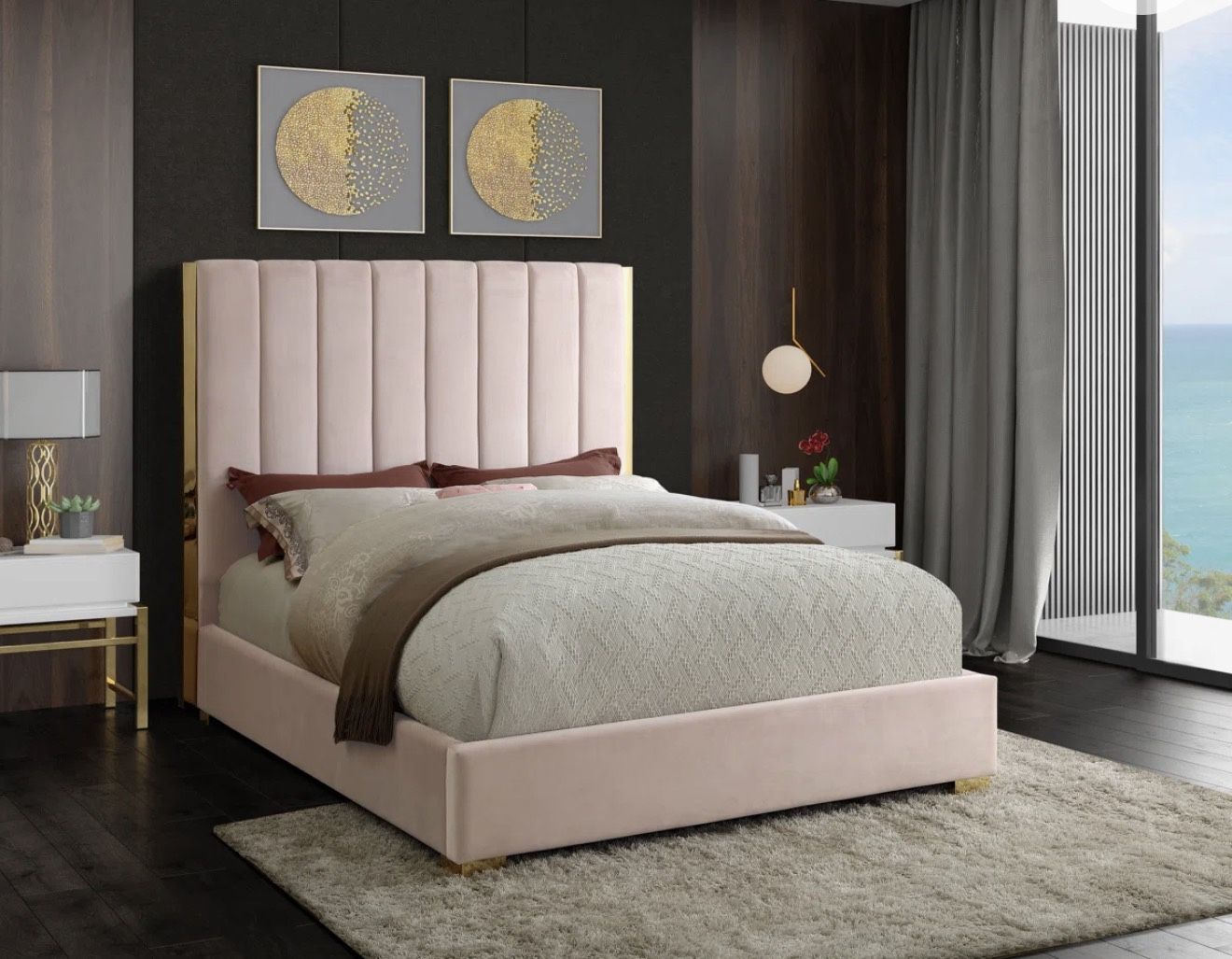 King bed, upholstered, headboard, and velvet all over frame with gold metal accent and frame all over. With a hybrid mattress and top a very lightly used not fitting new apartment space. Bought the bed itself for $1995! Only interested serious buyers no haggling. Only available for pick up and cash or Zelle payment. No negotiations.