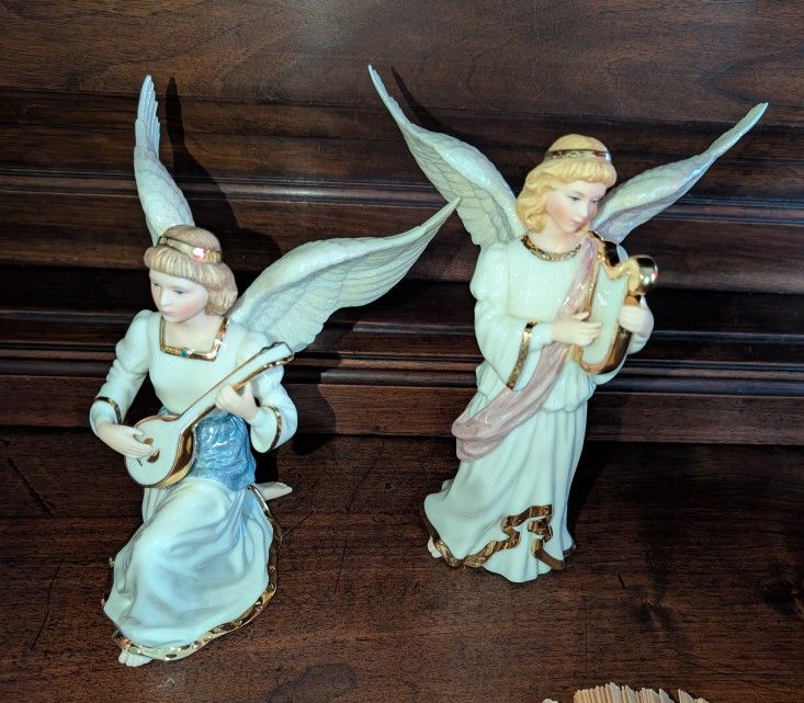 LENOX "ANGEL'S SERENADE" Heaven's brightest troubadours have been portrayed in this exquisite pair of ivory china sculptures. One beautiful angel plays the mandolin -- the other, the harp. The angels expressive faces are painted entirely by hand. Accents of pearlescence bring iridescent light to the angels' wings and luminous color to their sashes. Accents of pure 24 karat gold gleam from their robes, halos, and instruments .Bears the Lenox Hallmark. •Height of angel w/mandolin: 5.75" •Height of angel w/harp: 7.5". MSRP $136