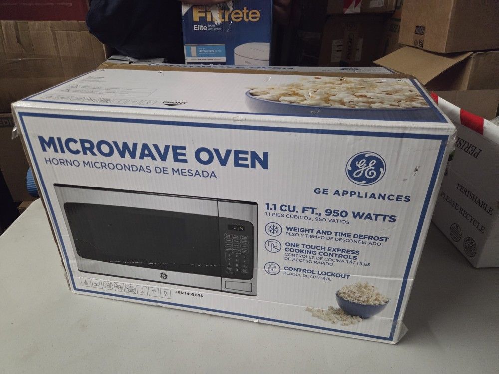 GE Compact Countertop Microwave Oven, 1.1 Cubic Ft., 950w Capacity, 6 Auto Cook Settings, Child-Lock Technology, Dorm Room, Apartment, Stainless Steel Open box $50 Pick up Mesa Higley and University