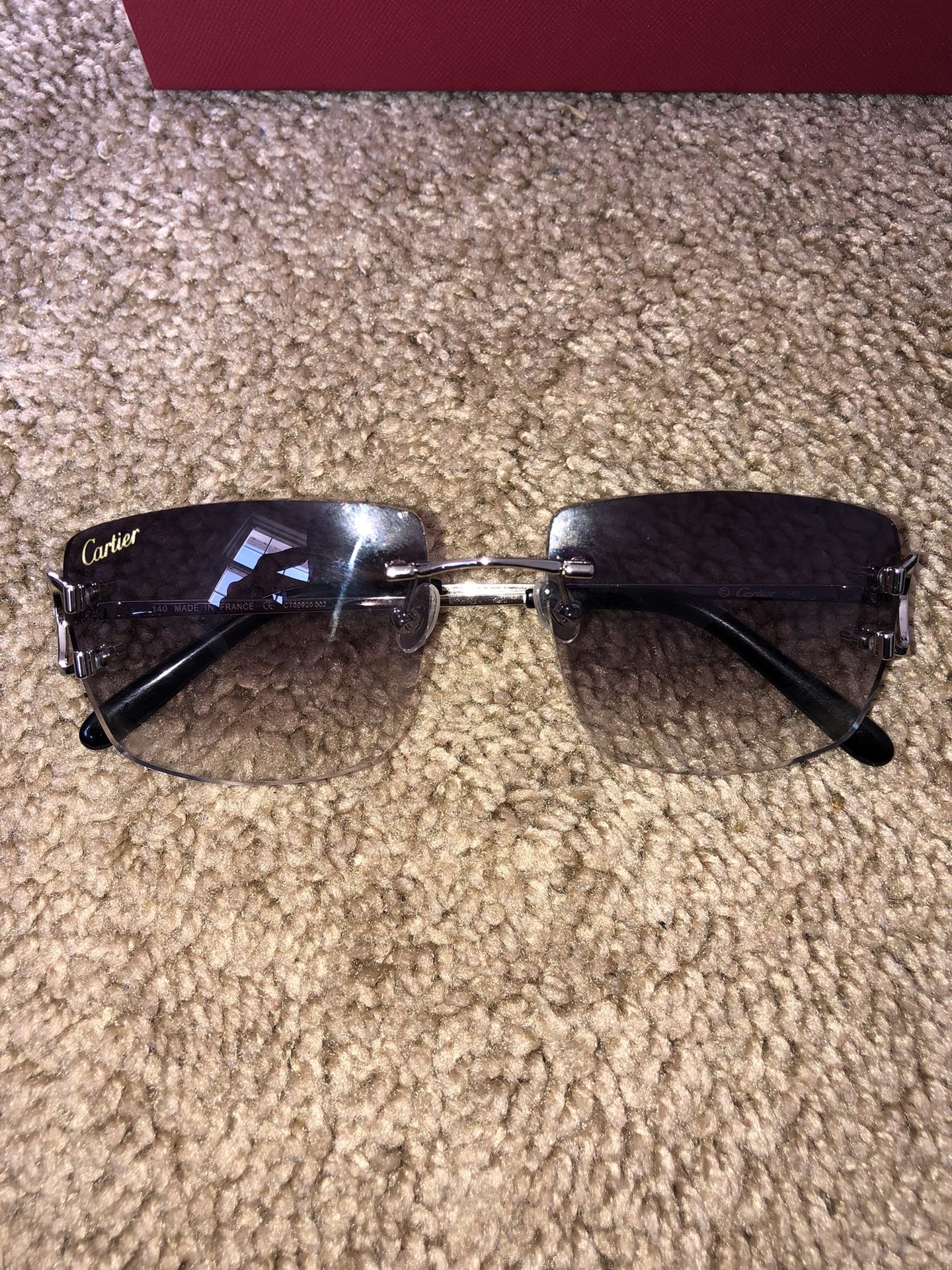 Elevate your style with these stunning Cartier sunglasses. With a silver metal frame and purple tinted glass lenses, these sunglasses are the epitome of luxury. The big C style is perfect for both men and women, and the lens technology ensures maximum protection from the sun's harmful rays. Made in France, these sunglasses are a true testament to the country's reputation for quality. The Cartier brand is synonymous with elegance and these sunglasses are no exception. Add them to your collection today and step out in style.