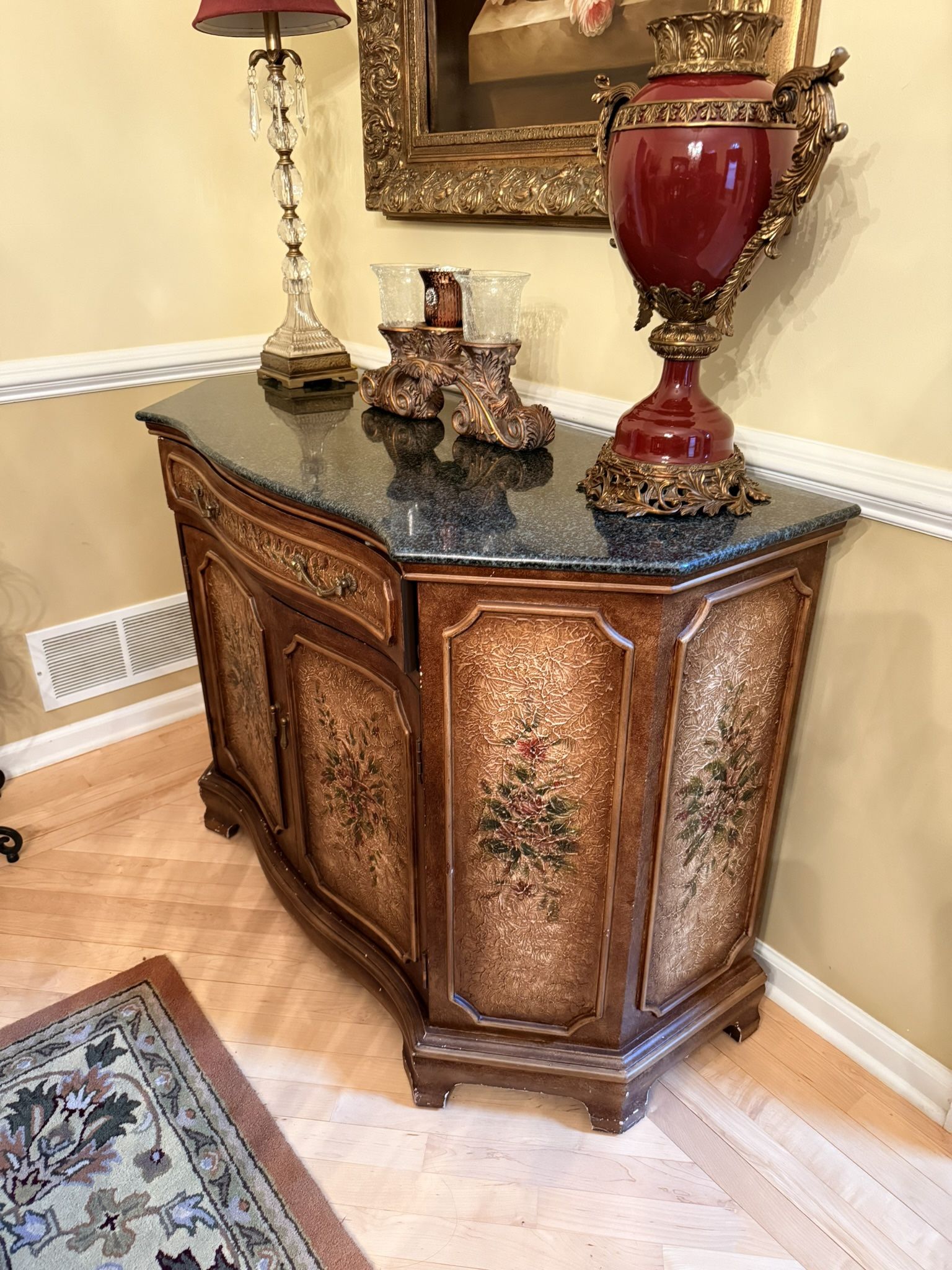 Wood side cabinet, stone top