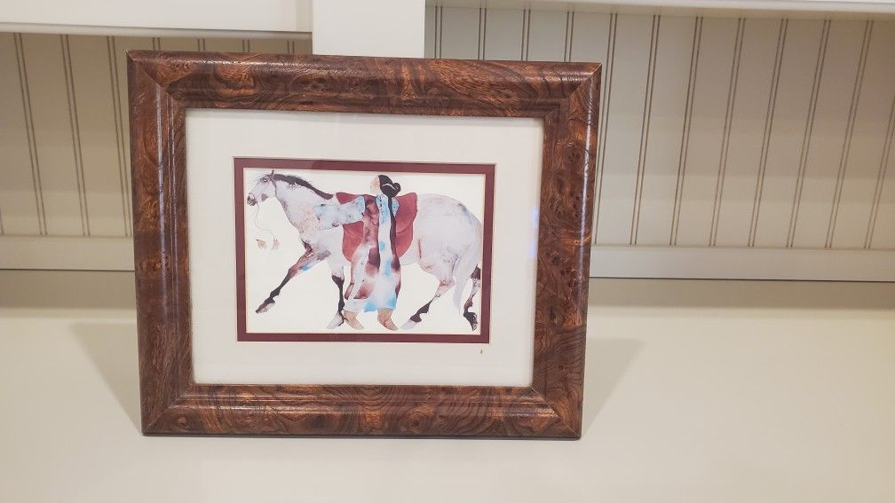 This beautiful watercolor lithograph by artist Carol Grigg (1948 – 2018), world renowned, inspired by her heritage (Cherokee) and beliefs, creates art with a nature motif. She is a self-taught artist and her work focuses on images of horses, birds, or people. A theme in much of Carol Grigg’s original art for sale is Native American riders on horseback, symbolizing Mother Nature. Carol Grigg poster prints infuse Native American history and culture into beautiful pieces that are easily accessible. “Holding Down Windrunner” by Carol Grigg is a lithograph in a beautiful 'burled wood' frame and is in superb condition (glare is present from the camera flashes). Frame Dimensions: 10-1/2” X 12-1/2”. Lithograph: 4-3/4” X 6-3/4”.