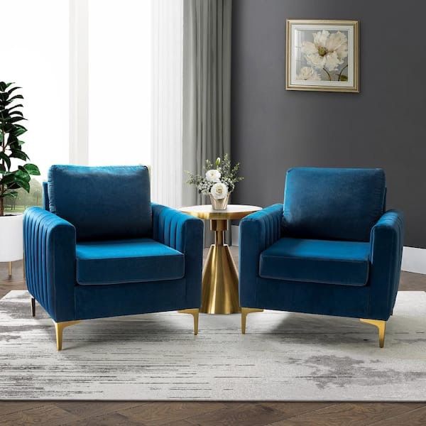 New in box. Pick up in Pomona Product Including: Two club chairs, assembly required. Contemporary Style: This upholstered accent club chair set offers outstanding comfort and is suitable for all kinds of interior decor. Strong and Durable: Perched atop sturdy metal legs bonded with a manufactured wooden frame, the entire chair is very stable. Design: This perfect accent club chair set with a tufted design and golden metal legs is suitable for the living room, office, bedroom, and other scenes. Easy to Assemble: Simple in structure, you can build this chair set with minimal effort. Pull together a glam-worthy living room with this modern chair. The velvet upholstery and eye-catching rich hue give this must-have chair a pop of sophisticated style. Vertical channel tufting and golden metal legs added depth to this glamour chair that effortlessly becomes the focal point in your living room. Perfect for a modern look with glam accents, this piece has a sturdy wood frame and features soft filling for an inviting feel. Add it to your room for a subtle touch of glam on its own. Versatile and elegant, this chair is ideally suited for a variety of decor styles in your living room, lounge room, or home office.Item size:32.5"Wx30.5"Dx35"H ,Seat size:22"Wx19"Dx18.5"