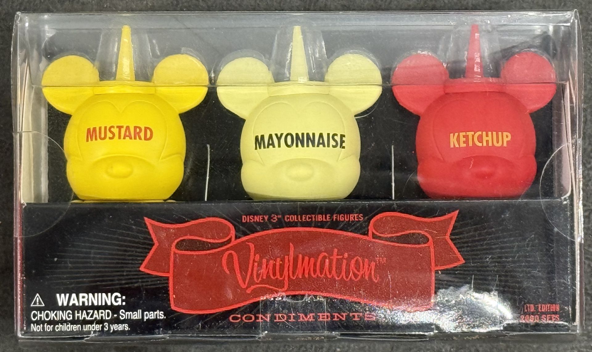Disney vinylmation condiment set limited edition, 2000 salt pepper, honey, mustard, ketchup, mayo
