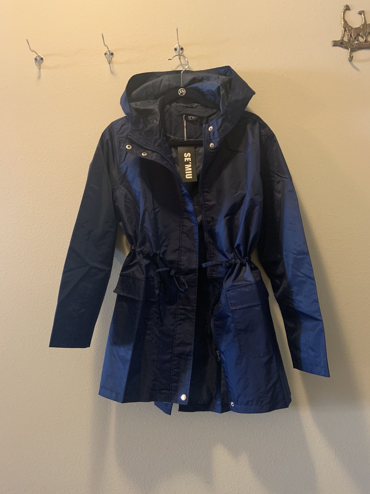 New Se’ Miu navy blue raincoat, women’s size large. Beautiful, lightweight, lined, with cinched waist. Feminine slit in back. Two front pockets and full zipper.