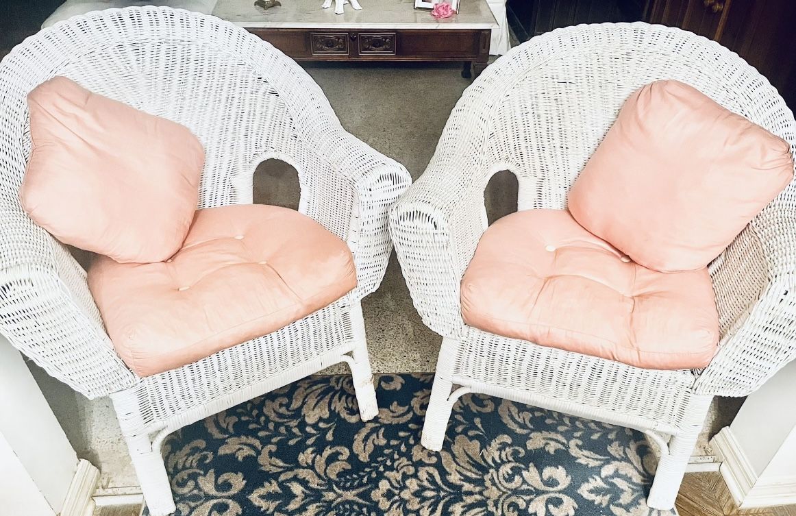 White shabby chic/cottage core wicker furniture. Heirloom pieces always kept indoors in a smoke & pet free home. In mint condition. Measurements 31 inches in width/height is 34 inches Cash only please.