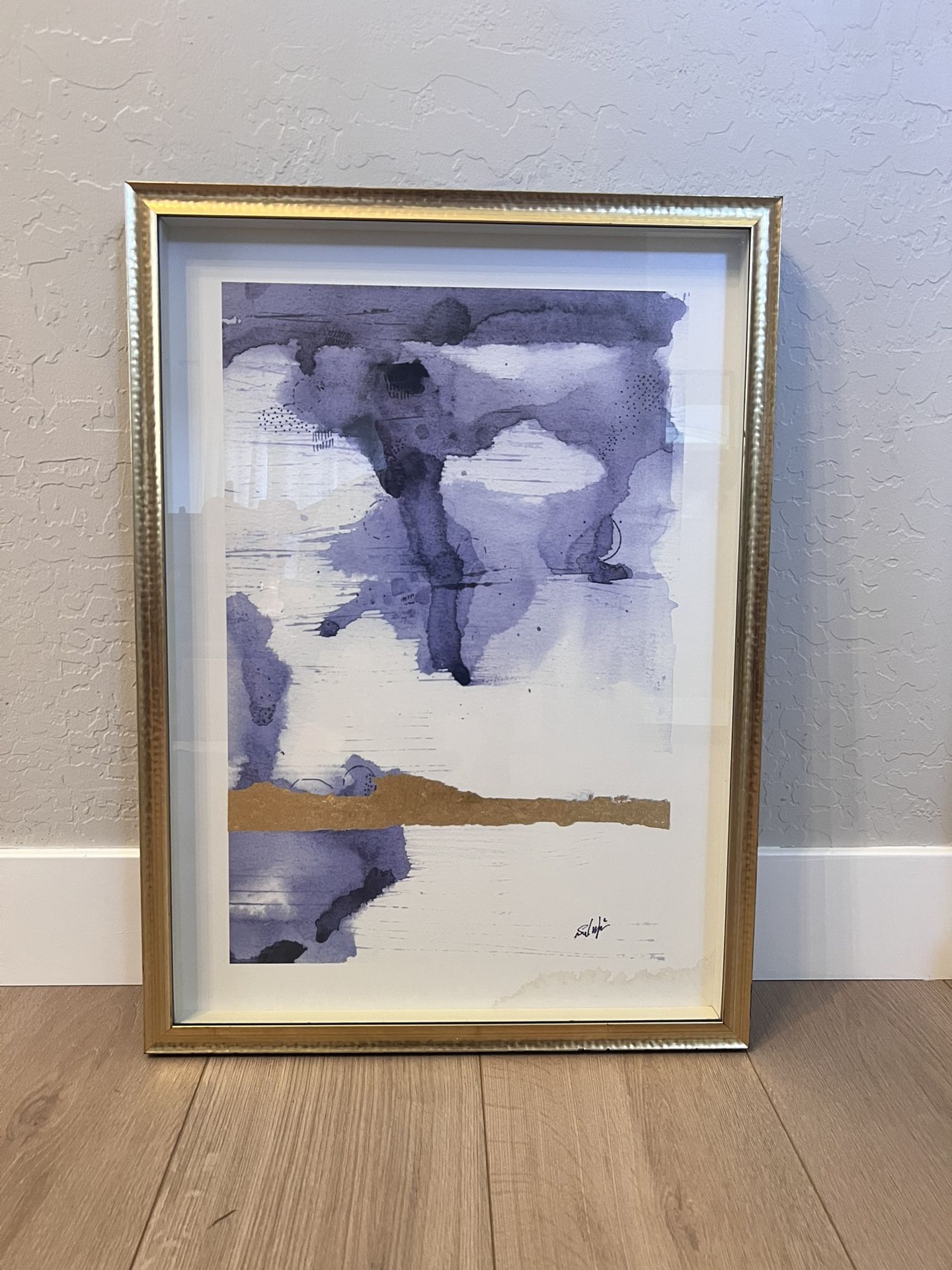 30x22 Glass Matte Gold/Black Framed Navy Blue/White/Gold Watercolor Artwork
