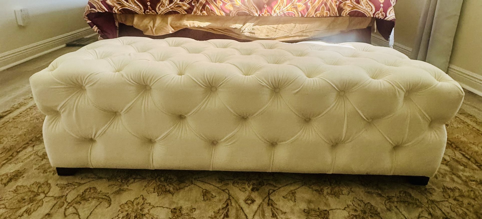 Upgrade your space with this luxurious tough ottoman in a soft neutral tone. Perfect for use as a coffee table for rest or extra seating. Size; 18.75 “ D x 59.75 “ W x 15.74” H Condition is excellent with minimal signs of use and tiny marks on it.
